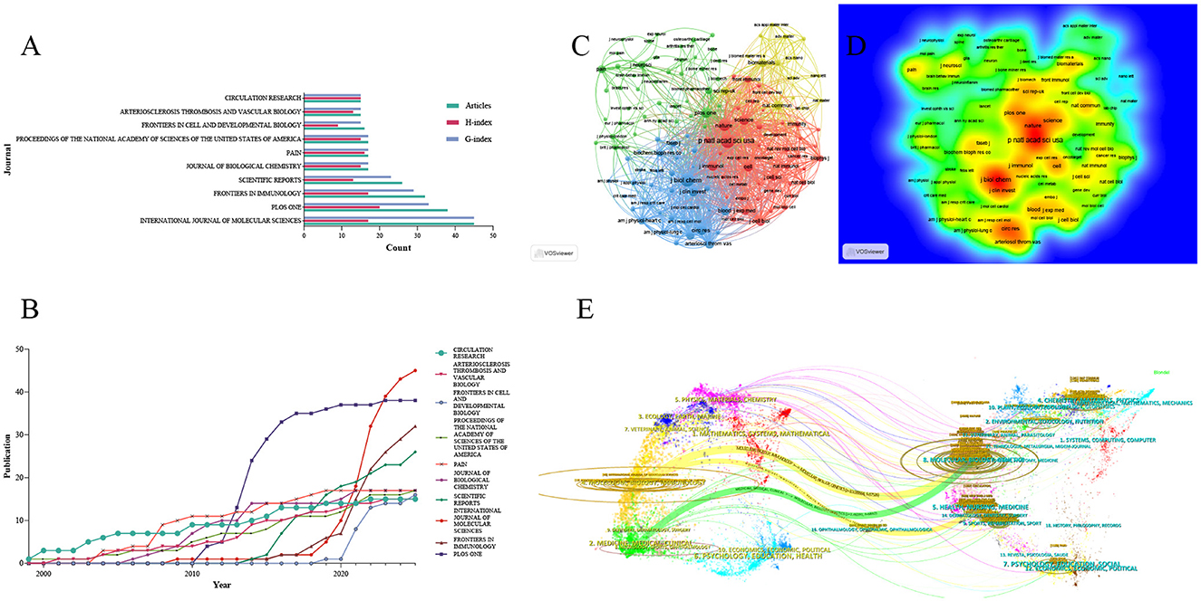 Figure 3. Influential journals in the research field of mechanoimmunology. (A) Publication volume, H-index, and G-index of the top 10 journals. (B) Annual publication volume of the top 10 journals. (C) Co-citation network map of influential journals. (D) Density map of influential journals. (E) Dual-map overlay analysis.