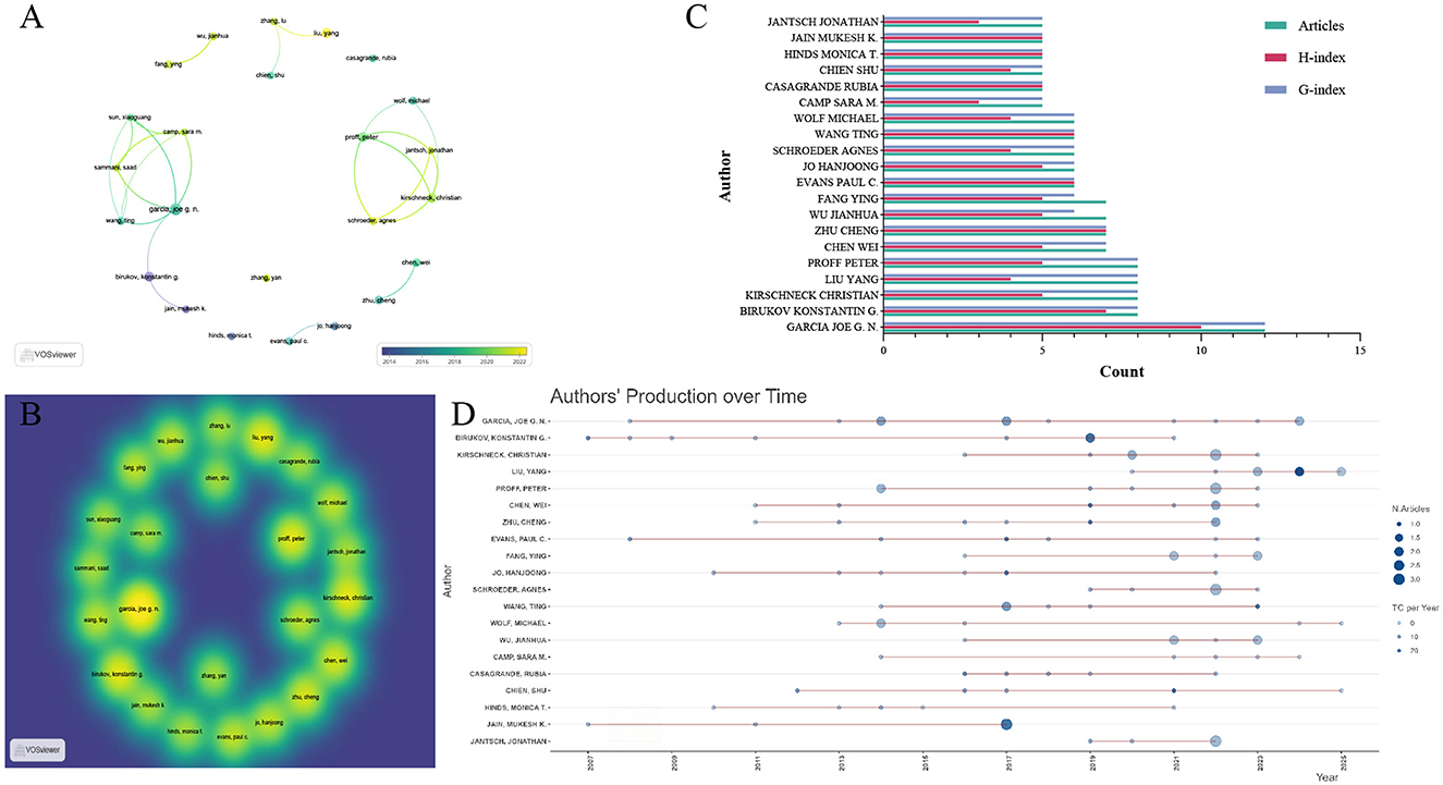 The top 20 authors in the field were selected based on their number of publications. Among these authors, Garcia Joe GN emerged as the most influential figure: he has conducted research in this field since 2008, with a total of 12 published articles, and his H-index (H-index = 10) and G-index (G-index = 12) are the highest among all included authors—these metrics collectively confirm his leading status in the domain. In the Scopus database, exactly the same result was also obtained—Garcia Joe GN identified as the most influential author (Supplementary Table S3). Liu Yang, by contrast, represents the most active emerging author in recent years in WOSCC. Among the top 10 authors ranked by publication count, Liu Yang had the highest M-index (M-index = 0.667). This observation is further supported by the author publication timeline: Liu Yang entered the field in 2020 and became the author with the highest average annual citation count in 2024, achieving an average of 29.5 citations per article that year (Supplementary Table S4). To gain deeper insights into collaborative dynamics, we further performed an author collaboration network analysis. This analysis revealed the formation of two major collaborative clusters: one centered on Garcia Joe GN and the other on Proff Peter. These findings indicate that both Garcia Joe GN and Proff Peter are pivotal leading researchers in this field (Figures 4A–D).