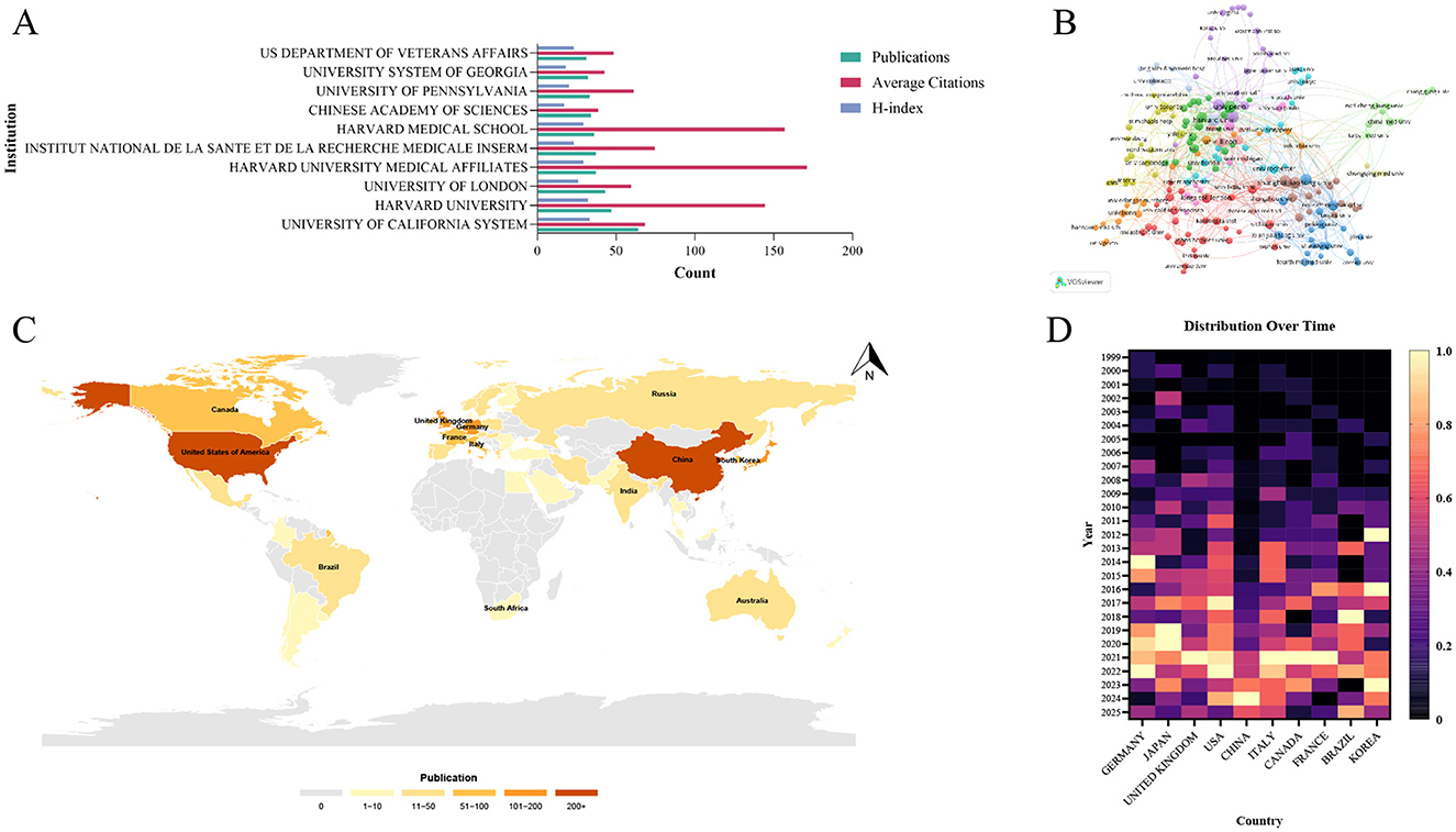 Figure 5. Influential institutions and countries in the research field of mechanoimmunology. (A) Publication volume, average citations, and H-index of the top 10 institutions. (B) Co-author network map of influential institutions. (C) World map of publication output by influential countries. (D) Distribution of independent standardized annual publication volumes among the top 10 countries.