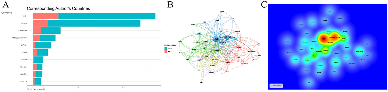 Figure 6. Inter-Country Collaboration. (A) The SCP and MCP of the top 10 countries. (B) Co-author network map. (C) Co-author density map. SCP, single-country publications; MCP, multi-country publications.