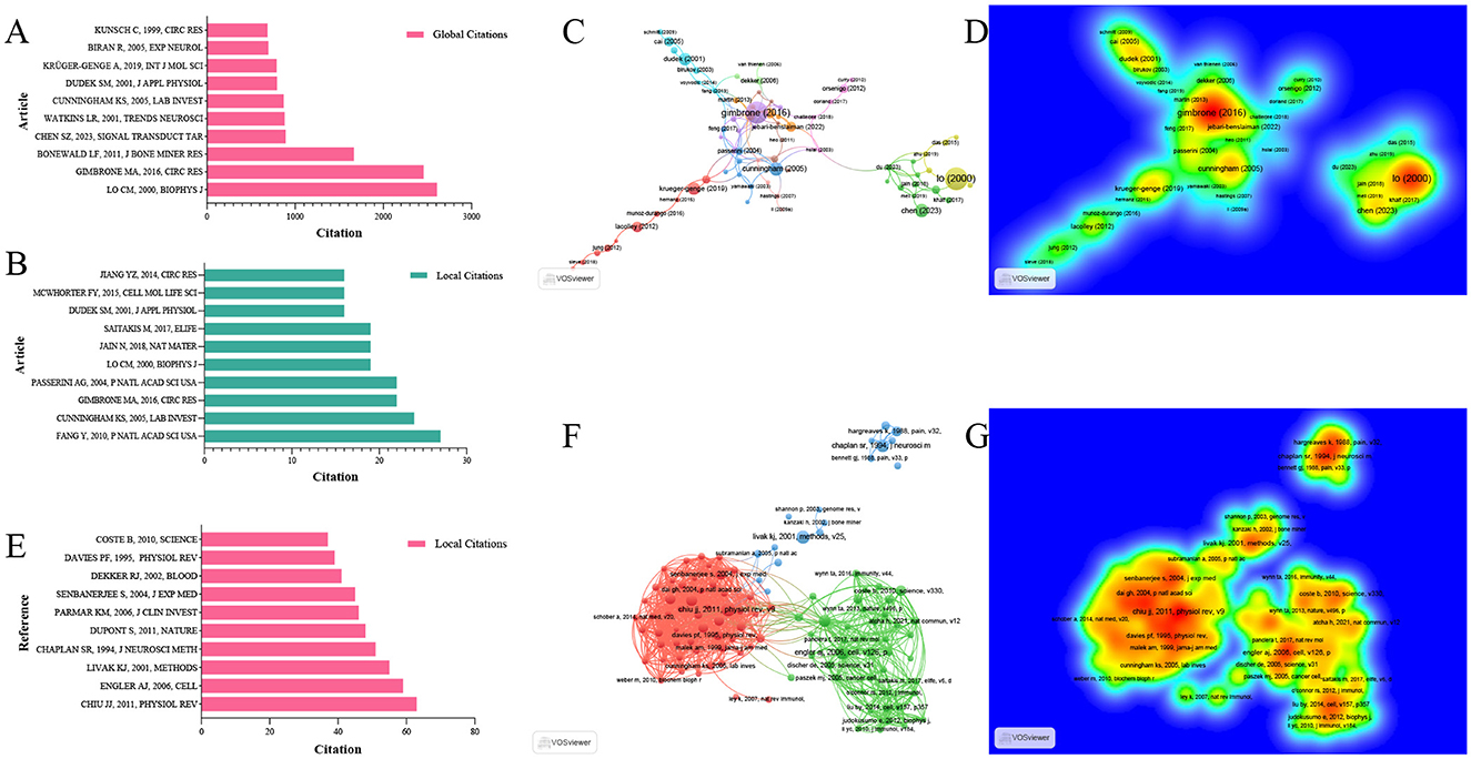 Figure 7. Analysis of highly cited articles and references. (A) Top 10 global cited articles. (B) Top 10 local cited articles. (C) Citation network map of highly cited articles. (D) Density map of highly cited articles. (E) Top 10 cited references in the research field. (F) Co-citation network map of highly cited references. (G) Density map of highly cited references.