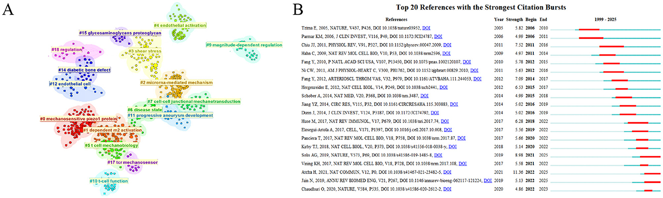 Figure 8. Cluster analysis and citation burst analysis of references. (A) Clusters of key terms in references. (B) Top 20 references with the strongest citation burst.