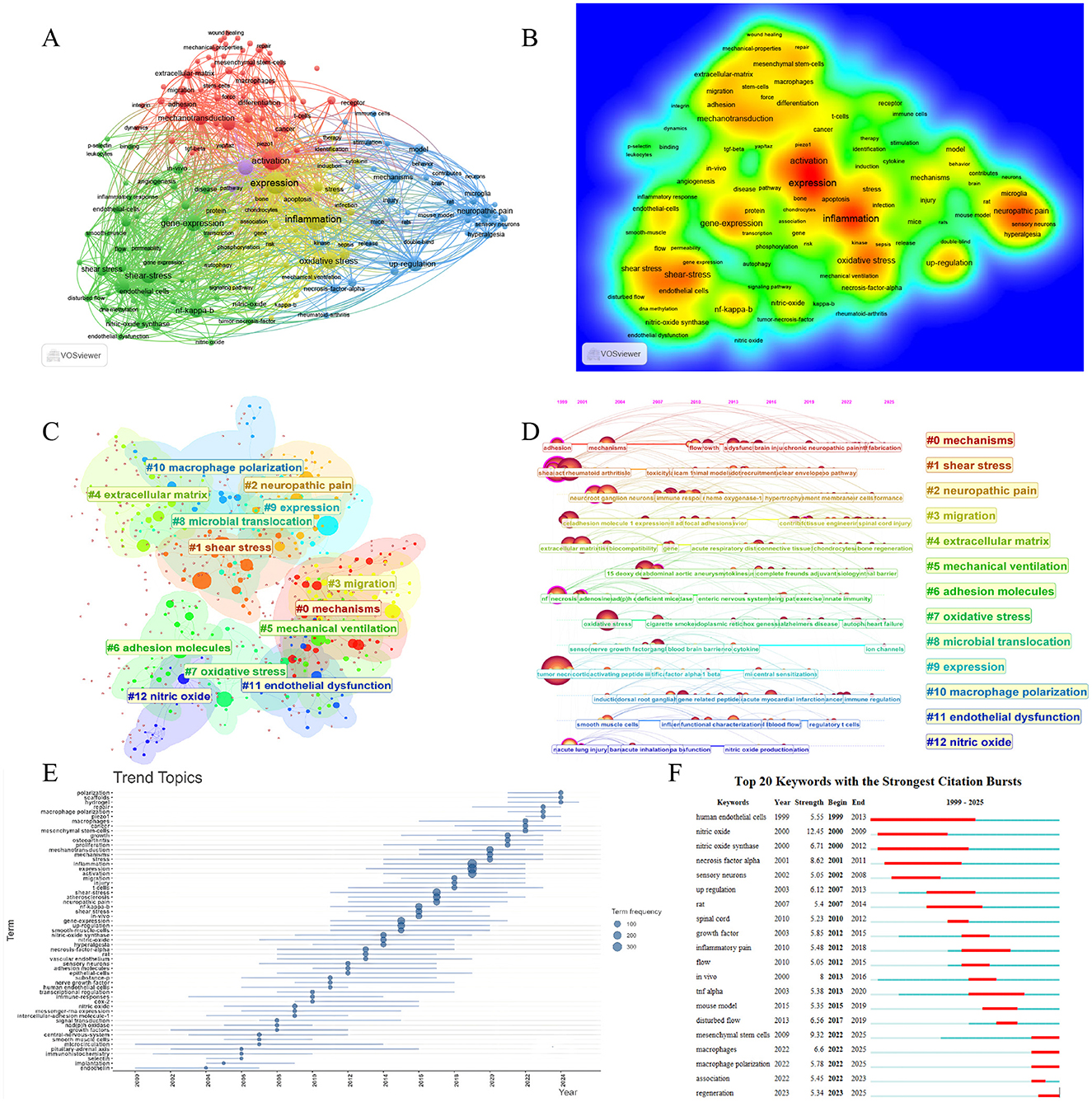 Through this keyword clustering analysis of WOSCC data, a total of 13 major clusters were identified, corresponding to the following themes: “mechanisms,” “shear stress,” “neuropathic pain,” “migration,” “extracellular matrix,” “mechanical ventilation,” “adhesion molecules,” “oxidative stress,” “microbial translocation,” “expression,” “macrophage polarization,” “endothelial dysfunction,” and “nitric oxide.” Concurrently, a timeline analysis was performed on these clusters (Figures 9C, D). The specific keyword lists for each cluster in the WOSCC database, as well as the keyword clustering results from Scopus, are all available in Supplementary Figure S3A, Supplementary File S1.