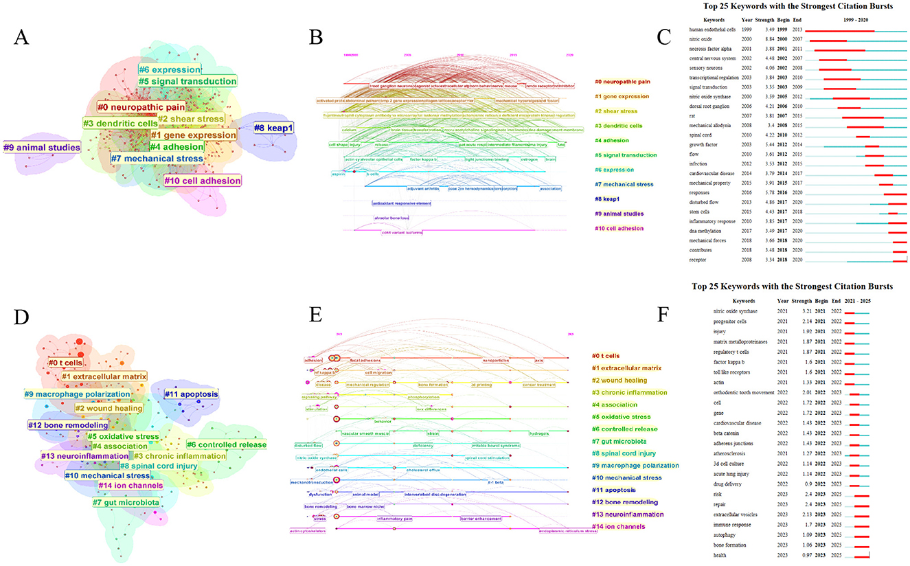 We re-conducted keyword clustering for the Research Exploration Phase and Research Explosion Phase of both WOSCC and Scopus data, and observed significant changes in the resulting clusters (Figure 10, Supplementary Files S4A–D, S3–S4). During the Research Exploration Phase, the major clusters in WOSCC were concentrated on keywords with broader descriptive scopes, such as “gene expression,” “shear stress,” “signal transduction,” “cell adhesion,” and “mechanical stress.” (Figures 10A–C) In contrast, the major clusters of the Research Explosion Phase featured more precise keywords—including “T cells,” “macrophage polarization,” “apoptosis,” and “ion channels”—which are more closely aligned with mechanistic research on immune-inflammatory regulation (Figures 10D–F). Concurrently, a shift in research directions was also observed. During the Research Explosion Phase, new major clusters emerged, such as “wound healing,” “gut microbiota,” and “bone remodeling.” This indicates that in recent years, research in the field of mechanical stress-mediated immune and inflammatory regulation has garnered attention from diverse disciplines. The influence of mechanical stress on wound repair by regulating immune-inflammatory responses has emerged as a direction of significant interest in recent years. For example, one study demonstrated that static mechanical stress with an amplitude of 15% promotes the polarization of macrophages toward the M2 phenotype, leading to increased release of anti-inflammatory cytokines and growth factors, as well as the activation of YAP and TAZ. This exhibits beneficial effects on enhancing wound angiogenesis and wound healing (55). Another study used an innovative skin stress-shielding hydrogel dressing to reduce the mechanical tension of wounds, thereby downregulating the expression of TGF-β1 and collagen I, and inhibiting the FAK/p-FAK pathway. This hydrogel helps reduce scar formation during wound healing (56). In the field of bone tissue repair, the latest research has found that fast stress-relaxing hydrogels exhibit a favorable osteogenic effect in a rat femoral defect model, with the simultaneous activation of TRPV4 and the Wnt/β-catenin pathway (57). Additionally, the role of mechanical stress in intestinal microbiota has gradually been explored. The latest research shows that in a Drosophila melanogaster model, groups of Drosophila melanogaster fed a indigestible diet containing methylcellulose exhibit increased microbiota-dependent ROS, activation of the IMD pathway, and an upregulation of IMD-dependent Tk expression. This suggests that diet-induced mechanical forces may have an impact on the immunity and metabolism of the digestive tract (58). Notably, clusters related to neurosurgery appeared in both the Research Exploration Phase and Research Explosion Phase. For instance, the Research Exploration Phase included clusters such as “neuropathic pain” and “dendritic cells,” while the Research Explosion Phase featured clusters like “neuroinflammation” and “spinal cord injury.” This consistency indicates that the role of mechanical stress in neuroinflammation regulation has consistently attracted attention. For example, this 2016 article systematically elaborates that mechanical stress can trigger the release of neuropeptides, which is one of the causes of neuroinflammation following traumatic brain injury (59).