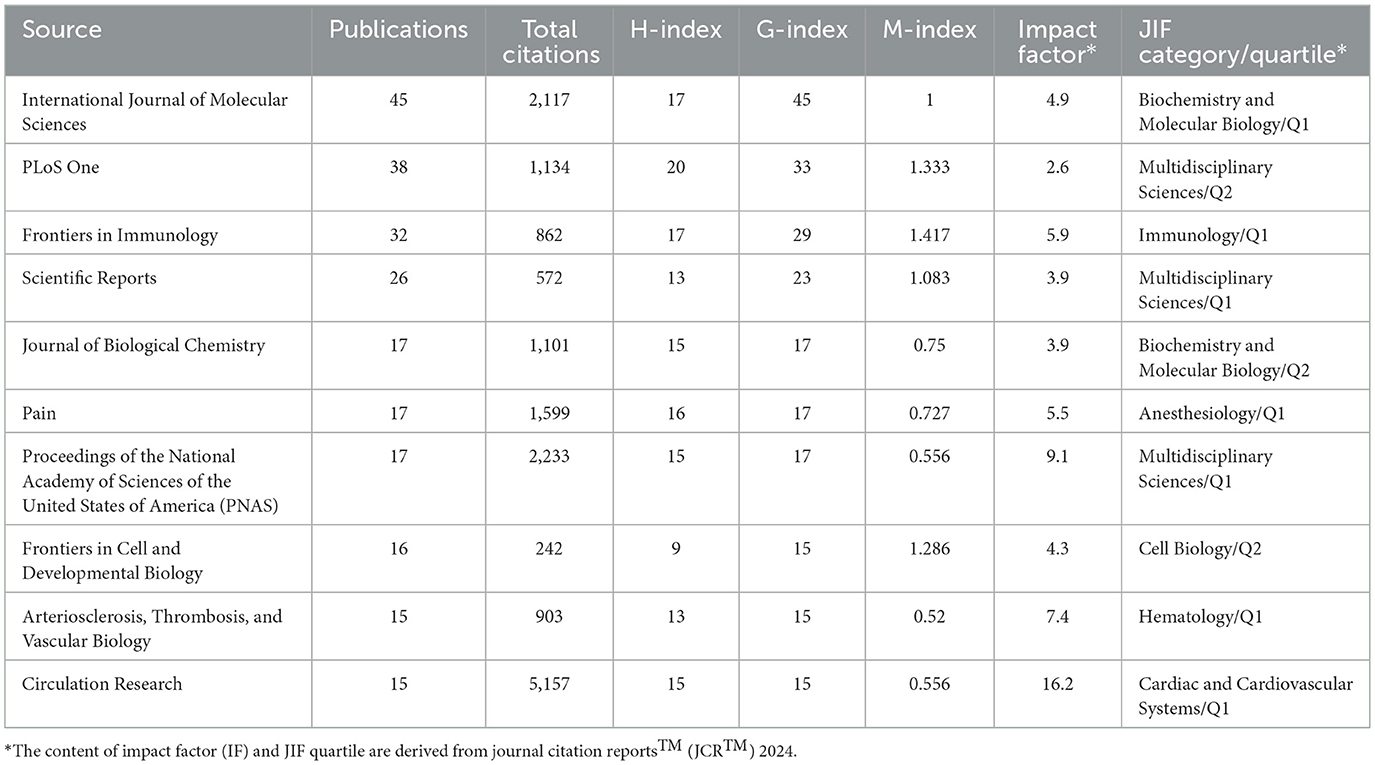 The top 10 journals in the field of mechanoimmunology were identified based on Bradford's Law. Among these journals, International Journal of Molecular Sciences had the highest number of publications and the highest G-index: it published 45 articles, with an H-index of 17 and a G-index of 45. This finding indicates that although this journal only has 17 highly cited papers, there are a small number of studies with extremely high citation counts in its published works, which have significantly boosted the total cumulative citations. For example, two articles focusing on vascular endothelial cell biology and the pathophysiology of atherosclerosis have been cited a total of 1,286 times. This also indicates that the relationship between hemodynamics in cardiovascular diseases and immune-inflammatory regulation may be a critical component of research in this field (27, 28). PLoS One ranked highest in terms of H-index (H-index = 20), while also having 38 publications and a G-index of 33. These metrics demonstrate that this journal carries substantial weight in the relevant field, with its papers excelling in both quantity and quality. Additionally, Frontiers in Immunology deserves attention as it had the highest M-index (M-index = 1.417). This high M-index suggests that Frontiers in Immunology is the journal with the highest impact per unit time in the field of mechanoimmunology, and has garnered greater attention in this domain in recent years (Figures 3A, B, Table 1). The same pattern was observed in the Scopus database, where International Journal of Molecular Sciences, Frontiers in Immunology, and PLoS One remained the top three journals in terms of influence in this field. Various indices for each journal, calculated based on Scopus data, are provided in Supplementary Table S2.