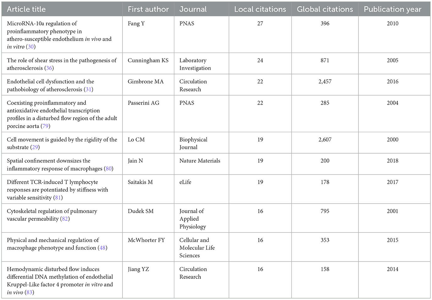 Research in the field of mechanoimmunology is currently in an explosive growth phase and cardiology and cardiovascular surgery have emerged as pioneering disciplines in this research area. This is attributed to the fact that hemodynamic factors—such as blood flow shear stress, which are inherent to cardiovascular diseases—constitute a key research focus of these disciplines. Among the top 10 most highly cited papers in the field, three are derived from cardiovascular disease research. For example, a study published in Circulation Research (cited 2,457 times) mentions that specific fluid mechanical stimuli can regulate endothelial genes that play critical roles in proinflammatory activation (31). Another paper, with 871 citations, also notes that shear stress appears to significantly influence vascular inflammation by regulating endothelial genes to acquire atherogenic properties (36). Among the top 10 local cited articles, as many as 6 are related to cardiovascular diseases or vascular endothelial cells. It is evident that researchers in cardiology and cardiovascular surgery were among the first to recognize the involvement of mechanical forces in inflammatory regulation, making them early contributors to this field. Notably, despite only 13 articles being published in 2005, this year achieved the highest average annual citation count. This phenomenon can be attributed to the six cardiovascular disease-related articles published in 2005, which accounted for 63.99% of the total citations that year (36–41).
