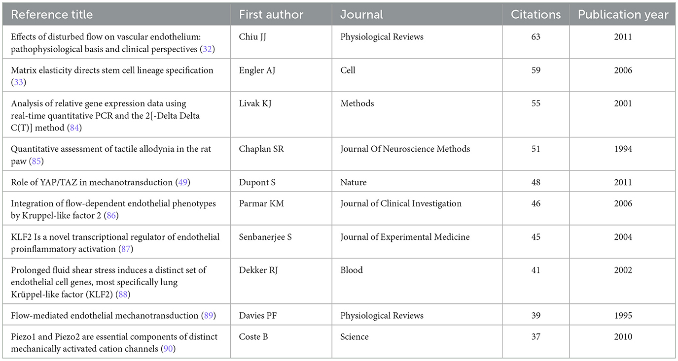 For all included studies in WOSCC, we conducted total citation analysis and local citation analysis. Local citations refer to the number of times a study is cited by relevant literature within this field, which can reflect the relevance of the study to the domain. The article published by author LO CM in 2000 in the Biophysical Journal had the highest total citation count (2,607 citations), ranking first among all included studies (29). Meanwhile, this article received 19 local citations within the field, placing it fourth in local citation rankings. In contrast, the article by author Fang Y, published in 2010 in PNAS, achieved the highest local citation count of 27, despite a lower total citation count of 396. This discrepancy suggests that Fang Y's 2010 article may have stronger relevance to research in this specific field (30) (Figures 7A, B, Table 2). We further performed a citation network analysis of all included literatures, which revealed two distinct core nodes in the citation network. One of these cores is the 2000 article by Lo CM, which was mentioned earlier. The other major core node in the citation network is the article published by author Gimbrone MA in 2016 in Circulation Research—a status consistent with its total and local citation data (31). Specifically, this article ranked second in total citations of 2,457 and third in local citations of 22 (Figures 7C, D, Supplementary Table S7).