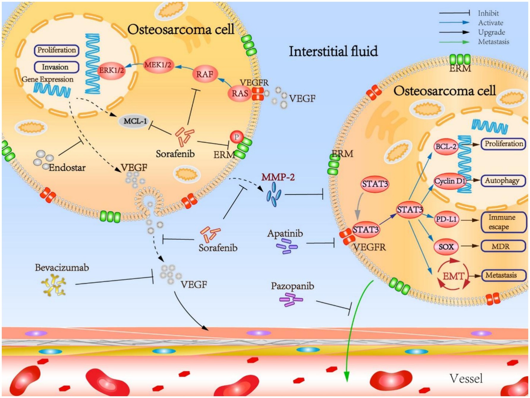 Angiogenesis is a key driver of osteosarcoma progression and metastasis, rendering it a significant therapeutic target. Apatinib, a VEGFR2 inhibitor, has demonstrated promising activity in advanced osteosarcoma, including partial responses and prolonged disease stabilization, in phase II studies (25). Similar, albeit modest, benefits have been observed with pazopanib and cediranib (26). Resistance to VEGFR inhibition develops rapidly as tumors activate alternative pro-angiogenic pathways or adopt invasive growth strategies (27). To address this issue, angiogenesis inhibitors have been combined with other therapeutic modalities, including checkpoint inhibitors. The normalization of tumor vasculature through VEGFR blockade may enhance immune cell infiltration, thereby potentially increasing the efficacy of immunotherapy (28).