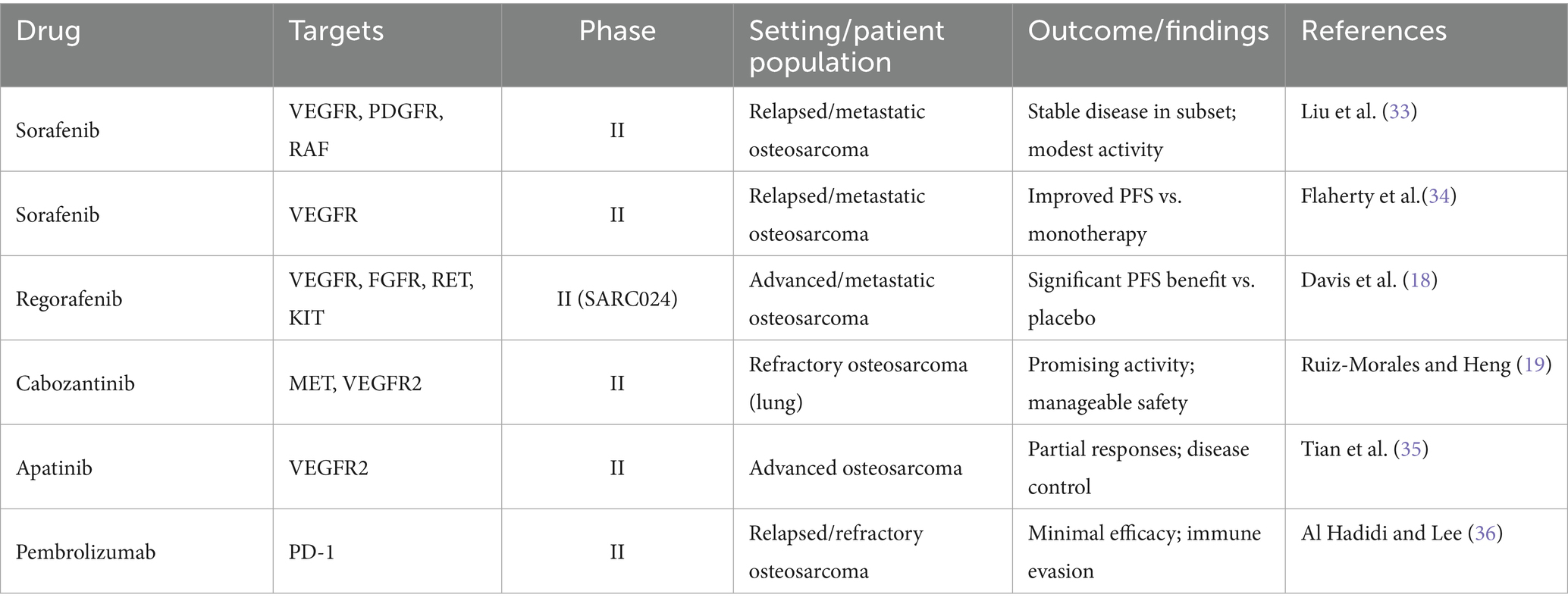 18. Davis, LE, Rushing, D, Attia, S, Bolejack, V, Riedel, RF, Reed, D, et al. Randomized double-blind phase II study of regorafenib in patients with metastatic osteosarcoma. J Clin Oncol. (2019) 37:1424–31. doi: 10.1200/JCO.18.02374