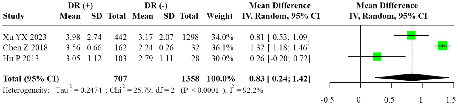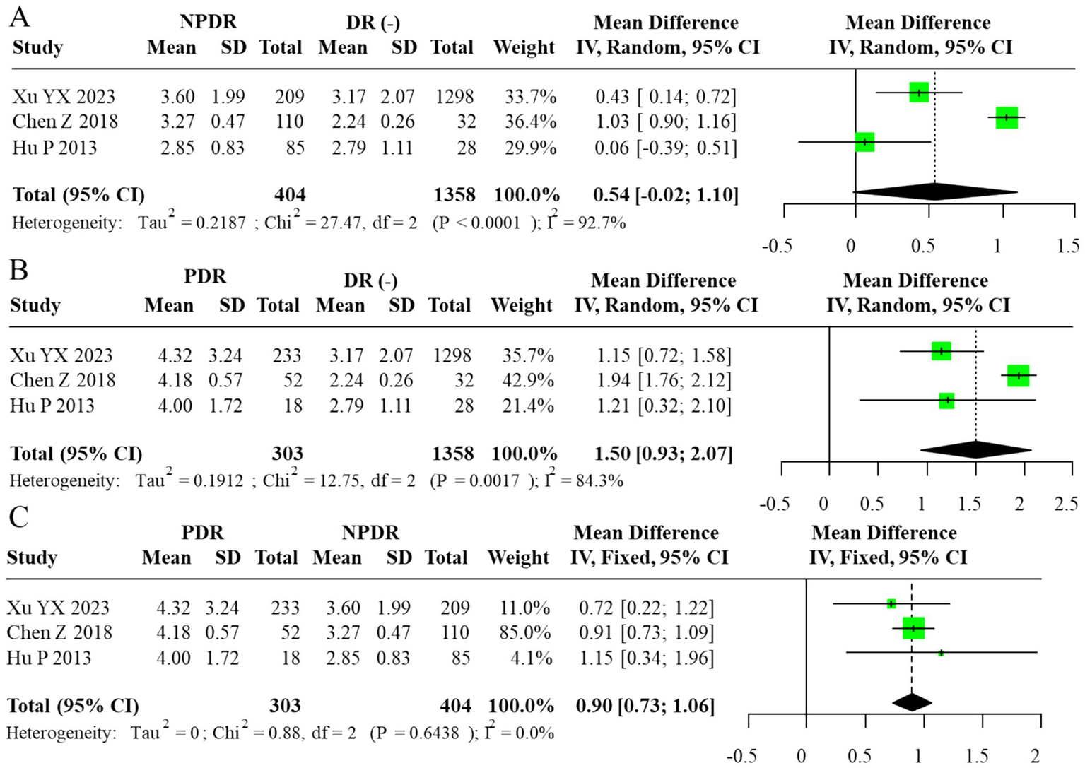 Given that the included evidence encompassed cross-sectional and case–control designs, we recognized that combining these designs may influence the interpretation of the pooled results. Cross-sectional studies reflect associations between lipid indices and prevalence of DR, whereas case–control studies may reflect odds or risk correlates. Therefore, pooled analyses were interpreted as reflecting the overall mean difference across study designs rather than causal inference.