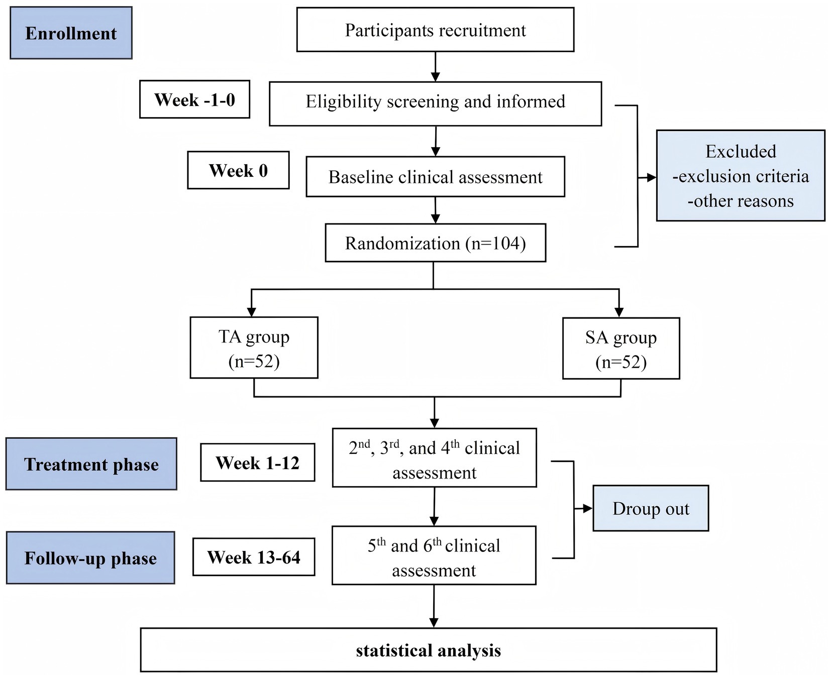 Blinding Assessment: Participants will complete a questionnaire at weeks 12 and 64 asking, “Do you believe you received true acupuncture or sham acupuncture?” with options: “yes,” “no,” or “unsure” (see Supplementary file 3). The Bang Blinding Index will be calculated to evaluate the success of blinding. This will be performed by blinded assessors unaware of group allocation (24). Treatment satisfaction: AEs, such as local pain, bruising, dizziness, or infection, will be documented at every treatment visit. Routine laboratory tests (complete blood count and liver and renal function) will be performed at baseline, week 12, and week 64 to monitor safety (15).