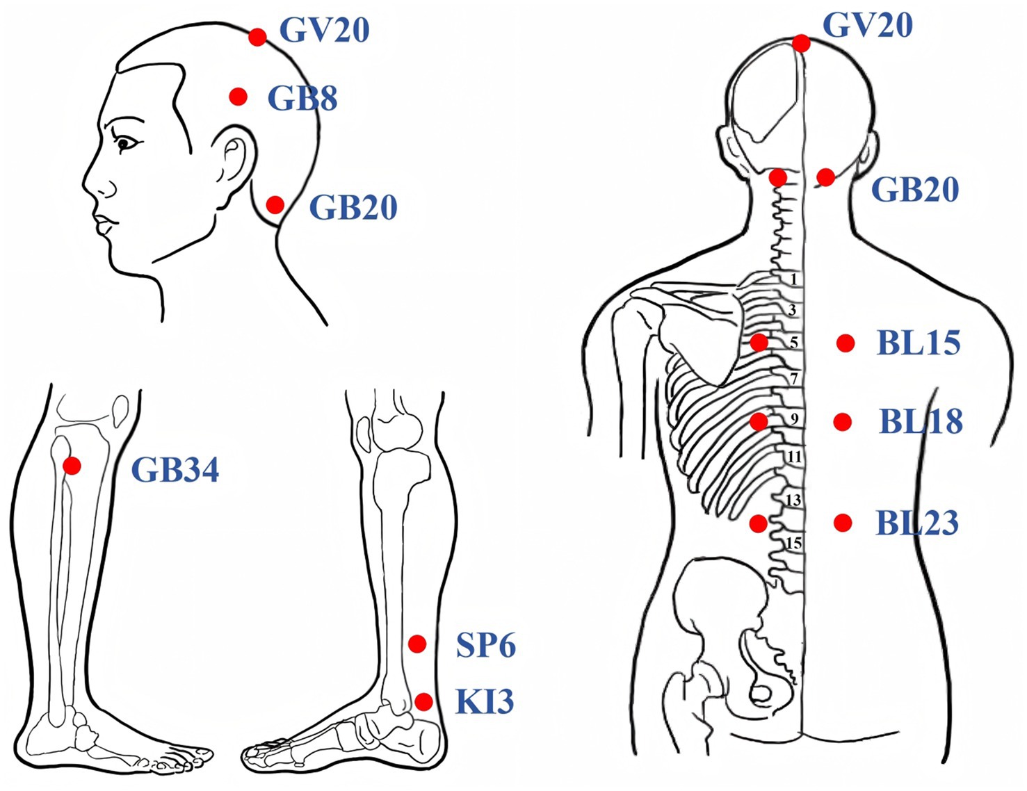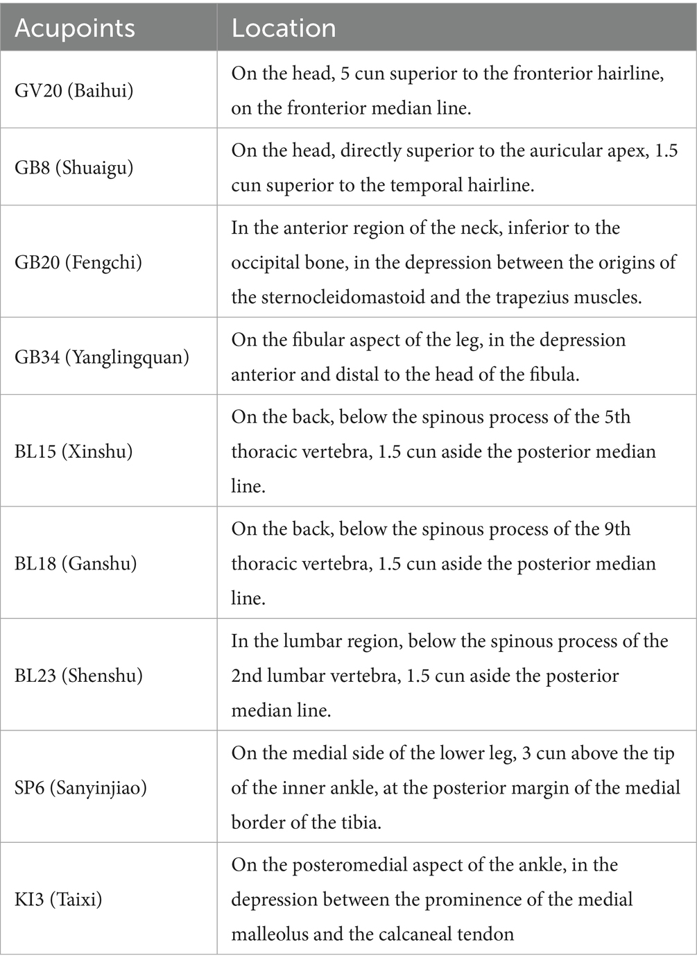 Participants assigned to the TA group will receive manual acupuncture using sterile disposable stainless steel needles (0.25 mm × 40 mm, Huatuo, Suzhou, China). Acupoints were selected based on prior clinical and preclinical evidence (14, 15). Acupoint prescriptions included GV20 (Baihui), GB8 (Shuaigu), GB20 (Fengchi), GB34 (Yanglingquan), BL15 (Xinshu), BL18 (Ganshu), BL23 (Shenshu), SP6 (Sanyinjiao), and KI3 (Taixi). The acupoint locations adhere to the National Standard of the People’s Republic of China (GB/T1236-2021) (33), as shown in Table 2 and Figure 2. Needle insertion depth ranges from 10 to 30 mm, depending on anatomical site. Needles will be retained for 30 min each session, with manual stimulation (twisting and lifting-thrusting) performed every 15 min to elicit the “deqi” sensation (such as soreness, heaviness, or distension). Treatments will be administered three times weekly for 12 consecutive weeks, totaling 36 sessions. Patients will be positioned prone with eyes covered to maintain blinding. Skin will be disinfected prior to needling. The intervention protocol follows the Standards for Reporting Interventions in Clinical Trials of Acupuncture (34). Licensed acupuncturists (with ≥5 years of experience) will receive standardized training on protocol adherence and confidentiality, with performance monitored via treatment logs.