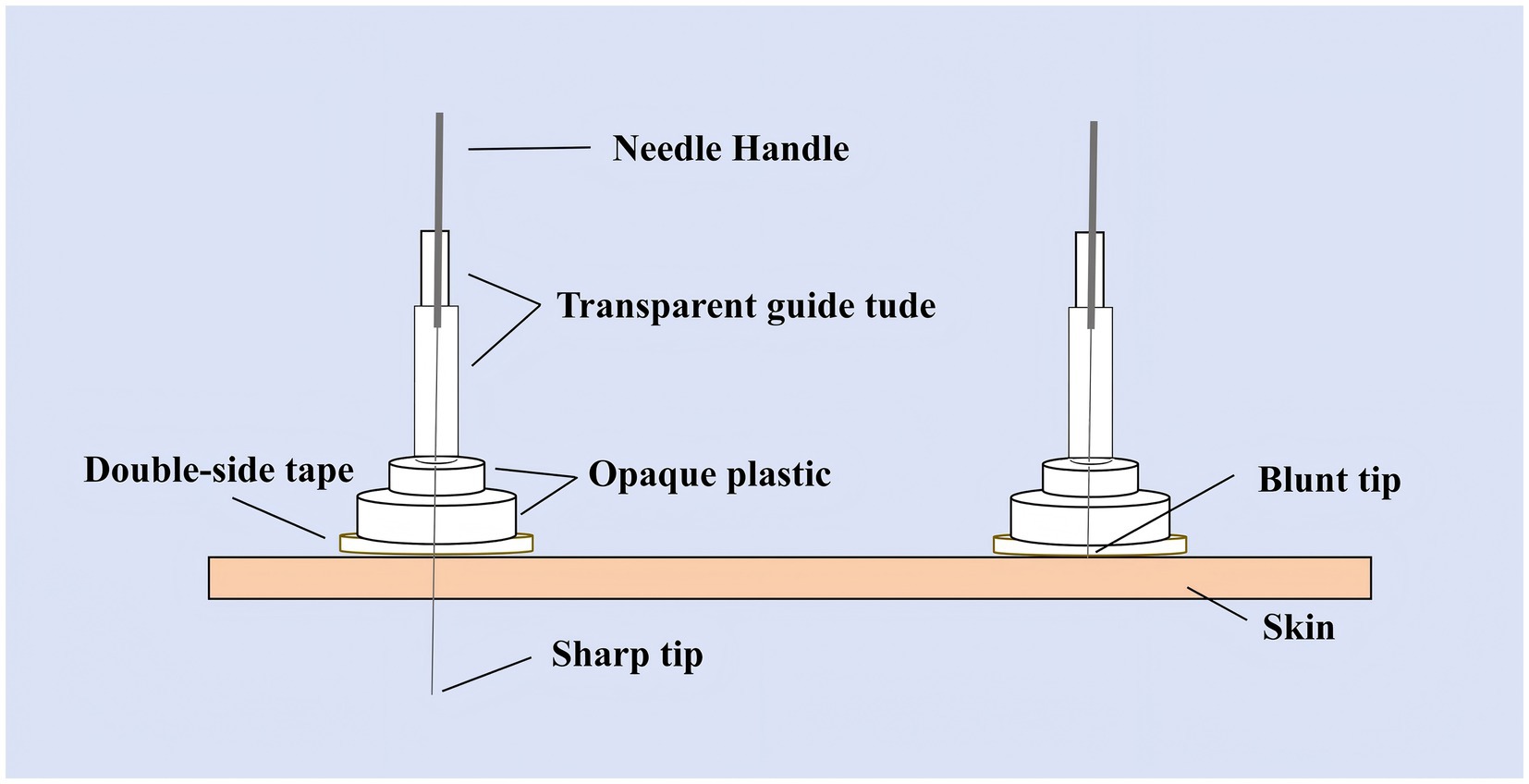 Participants in the SA group will receive treatment with the Park sham device applied to identical acupoints to ensure participant blinding. The device uses blunt, non-penetrating needles (0.30 × 25 mm and 40 mm, Huatuo, Suzhou, China) that simulate the sensation of needling without skin penetration (see Figure 3). The system comprises transparent tubes (Φ4 × 20 mm, Φ3 × 35 mm), double-sided adhesive tape (Φ1 × 15 mm), and opaque plastic bases (Φ4 × 15 mm, Φ5 × 10 mm), manufactured by Suzhou Medical Materials Factory, batch number 240407. Patients perceive needle contact without actual skin penetration. For scalp points, the blunt needle is secured with hairpieces to enhance stability (35). Treatment frequency, duration, and practitioner interaction mirror the TA group to maintain procedural consistency.