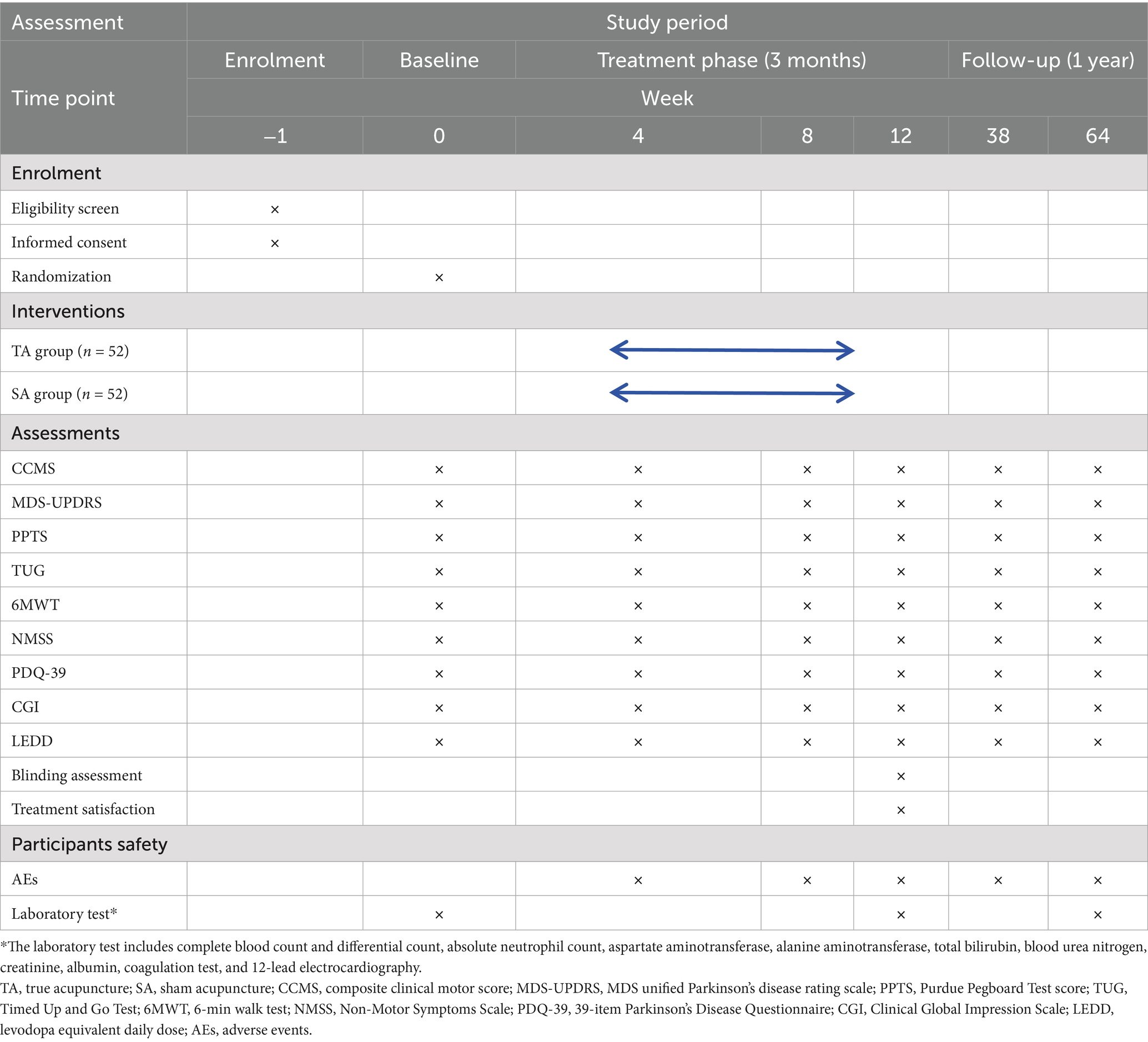 This is a single-blind, randomized, sham-controlled clinical trial designed to evaluate the efficacy and safety of acupuncture in treating motor dysfunction in early-stage PD. The study will be conducted at two clinical sites in Chengdu, China: the Hospital of Chengdu University of Traditional Chinese Medicine and the First People’s Hospital of Longquan District. Both institutions have well-established neurology and TCM departments, ensuring the standardized implementation of the protocol and reliable participant recruitment. The trial is scheduled to run from 21 January 2025 to 31 December 2028. Participant recruitment and interventions will take place between 1 September2025 and 1 September 2027. A detailed study flowchart is presented in Figure 1. The protocol follows the Standard Protocol Items: Recommendations for Interventional Trials (SPIRIT) 2013 Statement guidelines for clinical trial protocols (see Supplementary file 1) and is conducted in accordance with the ethical principles outlined in the Declaration of Helsinki (26). Ethical approval has been granted by the Medical Ethics Committee of the Hospital of Chengdu University of TCM (Approval No. 2025KL-020). The trial will be reported in compliance with the guidelines of the Consolidated Standards of Reporting Trials (CONSORT) (27), and it has been registered with the International Traditional Medicine Clinical Trial Registry (No. ITMCTR2025001290). A detailed schedule of enrollment, interventions, and assessments is provided in Table 1.