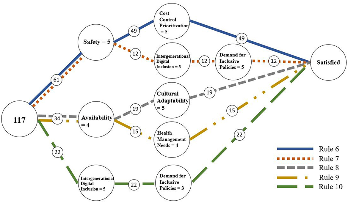 From the perspective of configurational theory, these ten rules collectively reveal the causal complexity and multiple pathways underlying satisfaction and dissatisfaction, demonstrating clear configurational equifinality and pathway diversity. Overall, dissatisfaction (Rules 1–5) is generated by various combinations of low levels of key conditions, whereas satisfaction (Rules 6–10) emerges from different combinations of multiple high-level conditions. This indicates that satisfaction and dissatisfaction are not simply opposite ends of a single continuum but are driven by distinct causal structures. To further illustrate the conditional combinations and decision pathways, the study visualized these rules using a decision flow graph (56) (as shown in Figures 3, 4), which helps reveal the structural relationships and pathway differentiation among different configurations.
