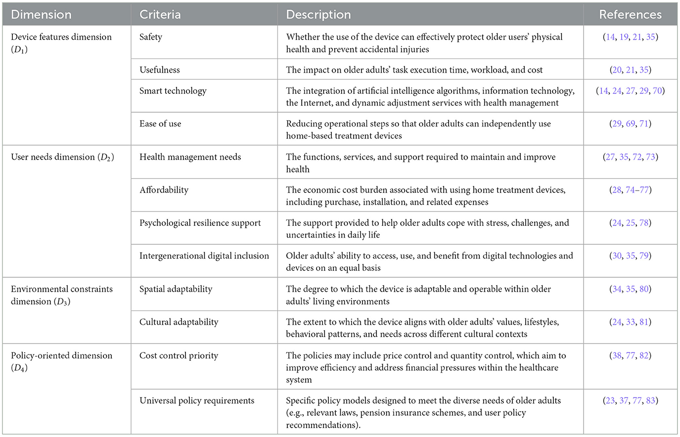 However, effectiveness depends not only on the device itself but also on contextual enablers: spatial and cultural adaptation in the home, supportive community resources, and policy/reimbursement frameworks (10–12). In other words, device performance is co-determined by the fit between technology, user, and environment. Yet a systematic framework to evaluate this multidimensional adaptation, and to guide selection and application for sub-healthy elders, remains underdeveloped, motivating the present study.