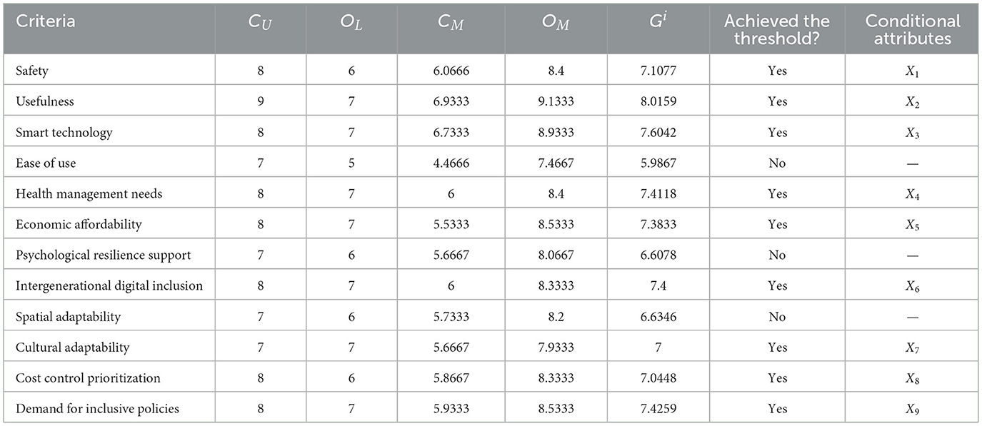 Most existing studies evaluate treatment devices from a single perspective (e.g., usability, technical performance, or clinical outcomes) without systematically integrating broader conditions which may influence user satisfaction. This narrow focus obscures the complexity behind elderly users' experiences. To address this gap, this study adopted an expanded literature search strategy. In addition to extracting candidate conditions from studies directly related to elderly/older adults/aging and home-based/home care/home rehabilitation and treatment/assistive devices, we also employed a snowballing approach (following references and citations) to identify additional factors that may influence user experience and satisfaction. These factors were ultimately organized into four analytical dimensions—device features, user needs, home and community environments, and policy orientations (see Table 1). The purpose of this inclusive approach was to ensure broad coverage of potential antecedent conditions. All preliminary indicators identified through this process were subsequently refined via the FDM and further distilled by RSA to determine the key antecedent conditions and their configurational relationships.