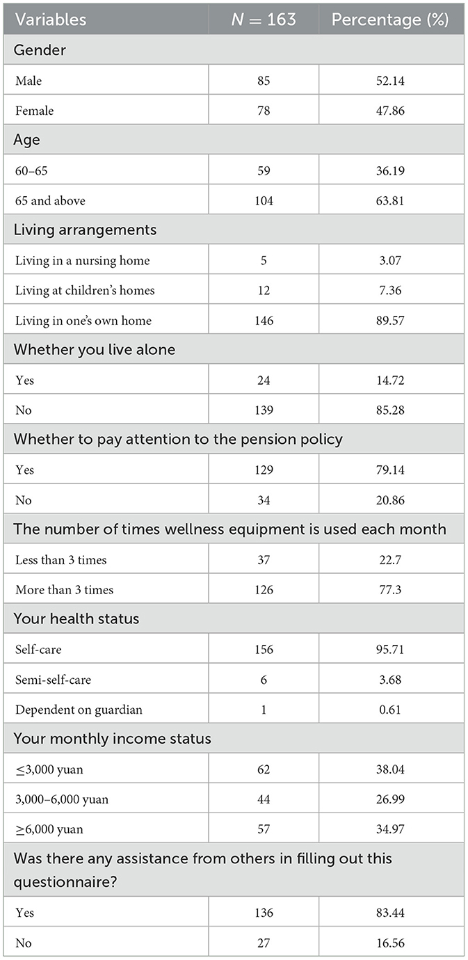 The survey for this phase was administered online via the Wenjuanxing platform (https://www.wjx.cn). The questionnaire consists of three parts. The first part collects background information from respondents, including gender, age, and product usage frequency. The second part asks respondents to recall their most recent experience using treatment devices, guided by a series of questions such as “Please provide the name of the treatment device you used most recently.” The third part focuses on the elderly population in Shibei District, Qingdao. Respondents are asked to evaluate treatment devices that left a strong impression on them, whether the experience was positive or negative. In this section, respondents assess each conditional attribute and decision attribute. Decision attributes (D) are evaluated using a semantic scale ranging from “dissatisfied (1)” to “satisfied (3)”; conditional attributes (C), which cover four dimensions and nine attributes extracted from the FDM results, are measured using a 5-point Likert scale ranging from “strongly disagree (1)” to “strongly agree (5)” (as shown in Table 3). The questionnaire data were collected from the elderly population in the old communities of Shibei District, Qingdao, between June and July 2025. A total of 226 questionnaires were collected, and after excluding invalid responses, 163 valid questionnaires were obtained, primarily due to the completeness of the questionnaire content. As shown in Table 4, the respondents were mostly aged between 60 and 80 years, with 77.3% of them using treatment devices at least three times per month, and most respondents had extensive experience using treatment devices.