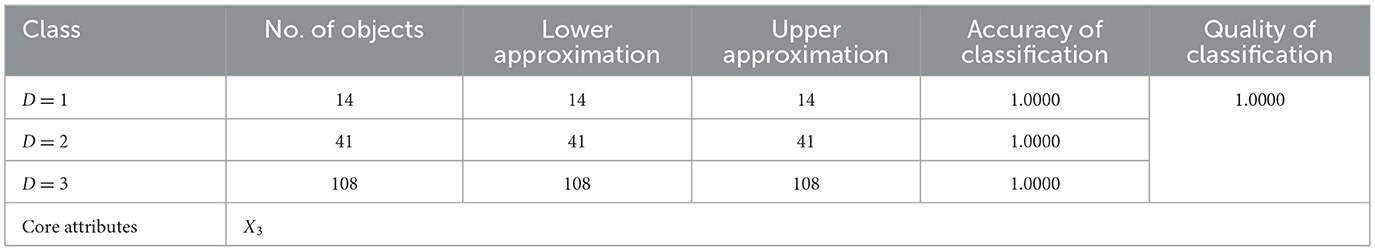 RSA, first introduced by Pawlak (51), provides a systematic approach for reducing attribute complexity and formulating decision rules. Its core principle is to approximate uncertain or imprecise concepts through the construction of lower and upper approximations based on equivalence relations. These approximations delineate the boundary of classification, enabling the identification of indispensable attributes, the elimination of redundancy, and the derivation of interpretable ‘if-then' rules.