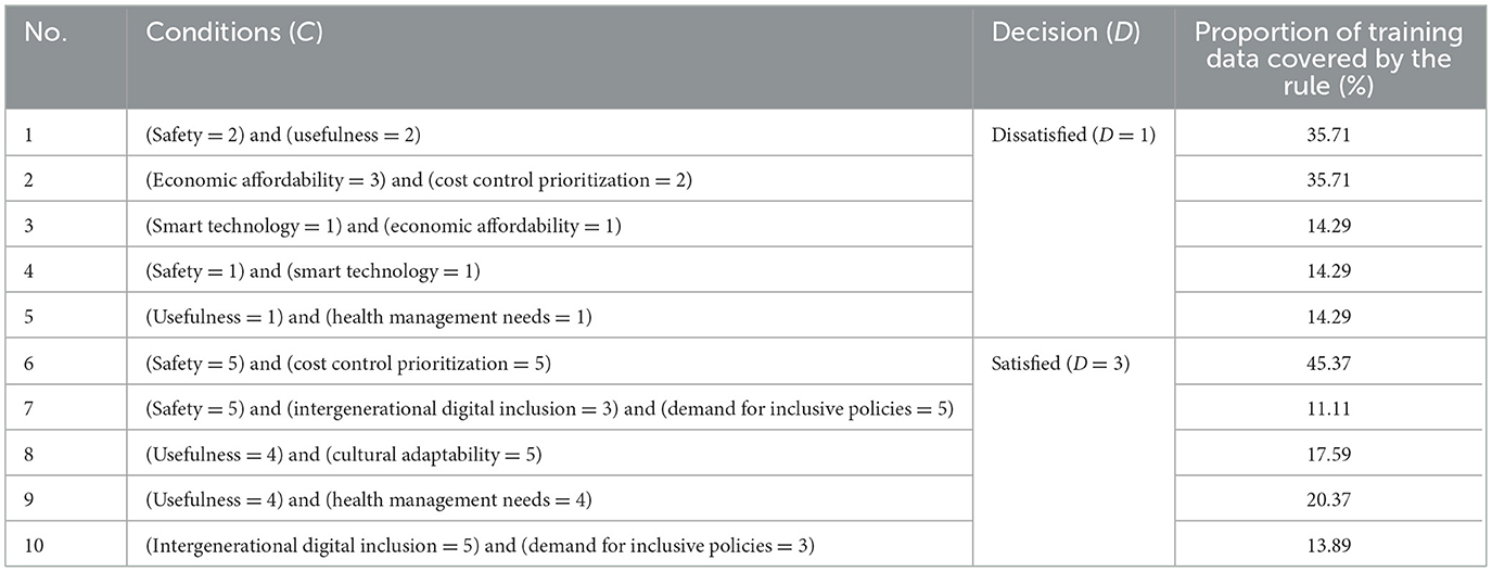 The data from the third section were used for RSA analysis. We used the ROSE2 software developed by the Intelligent Decision Support Systems Laboratory at Poznań University of Technology to generate decision rules. In RSA, the accuracy and quality of approximations are key parameters for extracting decision rules. The overall classification quality was 1, and the approximation accuracy for the three decision classes are shown in Table 5, indicating that the attributes in the dataset can effectively classify users' demand levels. Smart technology is a core conditional attribute, meaning that it consistently plays a pivotal role and has a stable, significant impact on outcomes. The RSA decision rule extraction process can generate a large number of rules, which are crucial for the analysis as they help determine whether all rules played a significant role in the classification process. This study selected rules with a coverage rate of no less than 10% from the RSA results. Coverage rate is determined by calculating the ratio of the number of samples supporting the rule to the total number of samples in the corresponding decision class. Since this study aims to identify directions for improving medical treatment devices, only rules with “D = 1” and “D = 3” were considered, resulting in 10 final rules, with rules 1–5 corresponding to D1 and rules 6–10 corresponding to D3, as shown in Table 6. These rules specify how distinct combinations of antecedent conditions coalesce into negative and positive pathways, thereby addressing RQ2 on how configurations jointly shape elderly users' satisfaction. To ensure the accuracy and reliability of rule identification, we employed a 10-fold cross-validation method, and the final average accuracy was 71.07%, indicating that the data are suitable for RSA analysis, and the generated decision rules are reasonable and reliable.