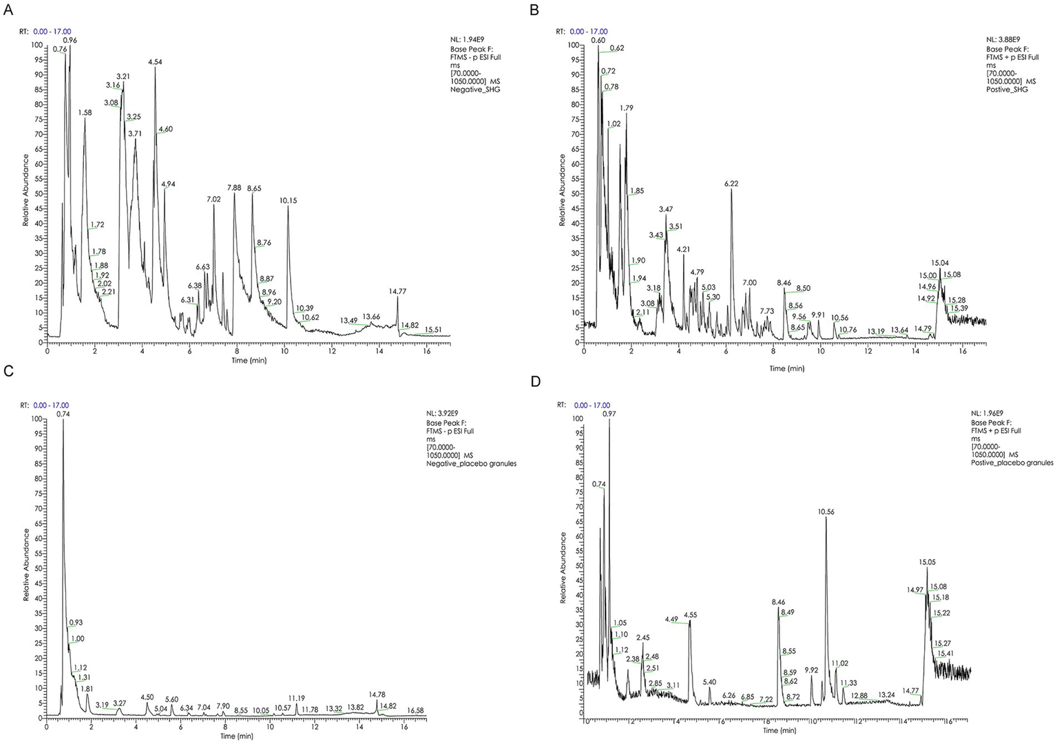 (A) BPI chromatogram of SHG in negative ion mode. (B) BPI chromatogram of SHG in positive ion mode. (C) BPI chromatogram of placebo granules in negative ion mode. (D) BPI chromatogram of placebo granules in positive ion mode.