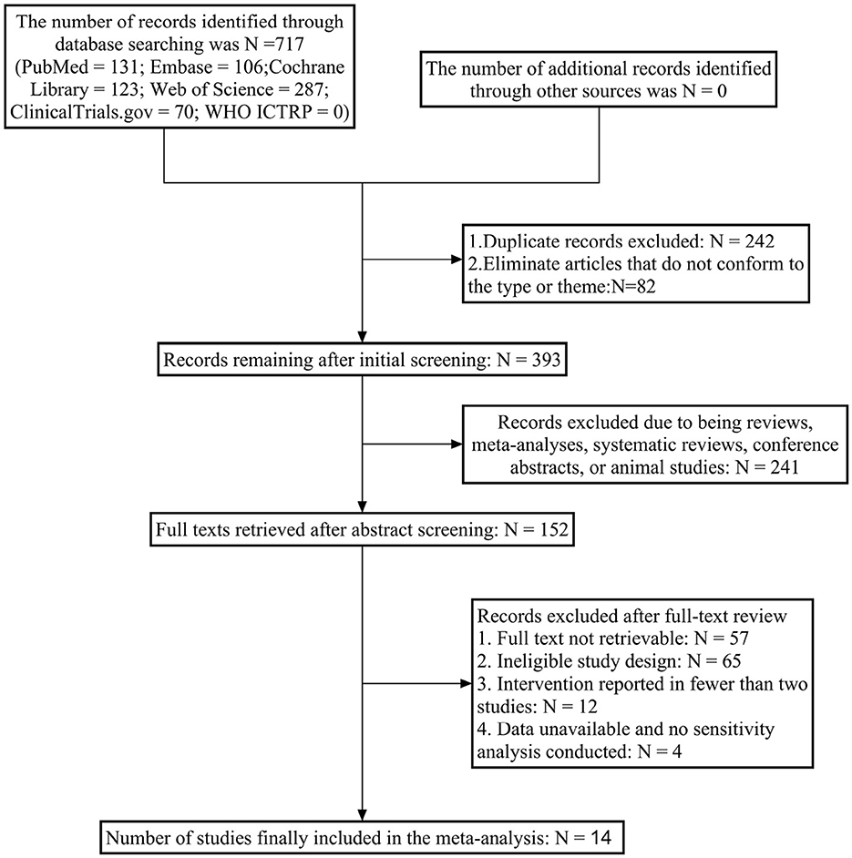 Initial searches across six English databases yielded 717 relevant articles. After removing 242 duplicates and excluding 82 articles with mismatched types or topics, 393 articles underwent preliminary screening. Following abstract screening, 241 articles (including animal studies, meta-analyses, and reviews) were excluded, resulting in 152 articles for further assessment. After full-text review, 138 articles were excluded due to unavailability of full texts, mismatched study designs, unusable data, or inability to construct outcome measures. Ultimately, 14 RCT (24–36) articles were included for network meta-analysis. The literature screening process is illustrated in Figure 1.