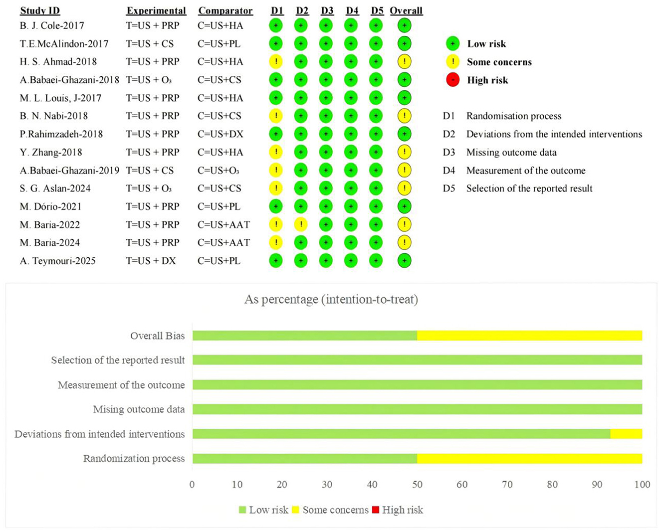 The 14 included RCTs involved 934 patients (intervention group: 468, control group: 466). All interventional approaches employed IAI therapies using US-guided localization combined with various agents, encompassing seven strategies: US+PL (3 studies), US+HA (4 studies), US+CS (5 studies), US+PRP (9 studies), US+O 3 (3 studies), US+DX (2 studies), and US+AAT (2 studies). The included literature was published between 2017 and 2025. Basic characteristics of the included studies are presented in Supplementary Table 1.