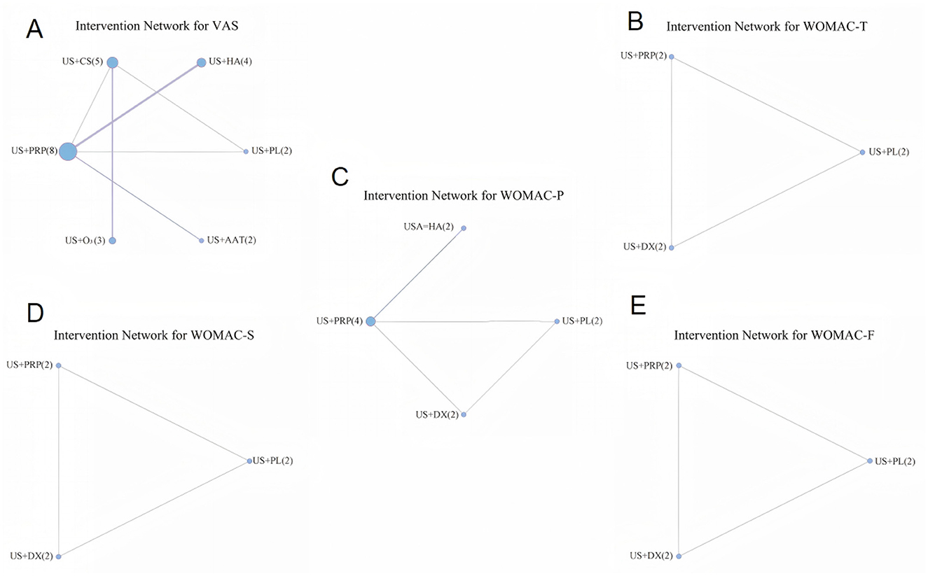 Figure 3. Evidence network diagrams for different outcome indicators (A: VAS, B: WOMAC-T, C: WOMAC-P, D: WOMAC-S, E: WOMAC-F).