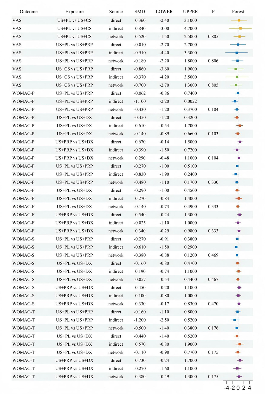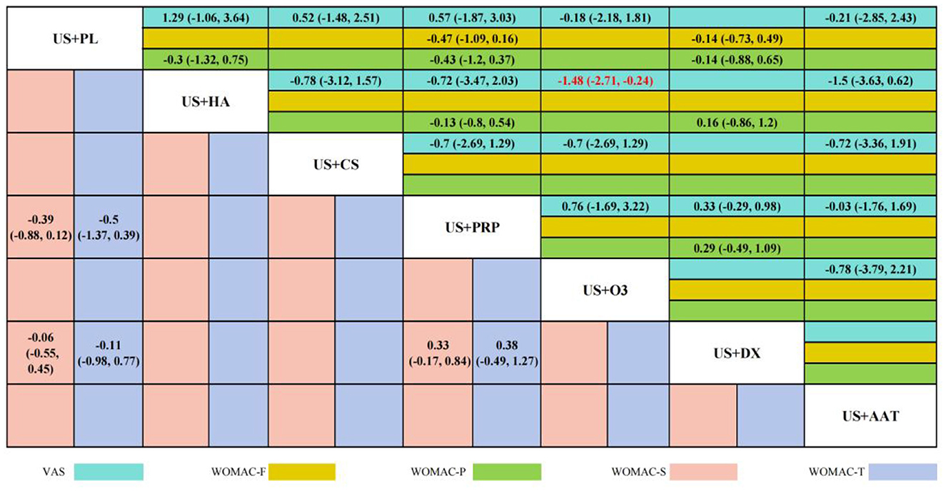 Twelve RCTs reported VAS scores involving seven IAI. BNMA demonstrated that only US+O3 vs. US+HA [SMD = −1.48 (−2.71, −0.24), p < 0.05] reached statistical significance, indicating superior efficacy of US+HA over US+O3 in pain alleviation. Although no statistical differences were observed among other intervention cohorts, Five RCTs reported WOMAC-P scores, three RCTs reported WOMAC-F scores, three RCTs reported WOMAC-S scores, and three RCTs reported WOMAC-T scores. These involved four interventional approaches: US+DX (dexamethasone), US+PL (placebo), US+PRP (platelet-rich plasma), and US+HA (hyaluronic acid). BNMA results indicated statistical significance exclusively in the US+HA vs. US+O3 comparison [−1.48 (−2.71, −0.24)], suggesting HA's superior efficacy over O3 in alleviating pain. No statistical significance was demonstrated in the between-group analyses of all other outcome measures. However, consistent SMD directions were observed across most comparisons. The overall trend indicated a potential advantage of US+PRP across multiple WOMAC dimensions, particularly in WOMAC-Pain [−0.47 (−1.09, 0.16)] and WOMAC-Stiffness [−0.33 (−0.84, 0.17)], where notable effect sizes emerged. Nevertheless, the confidence intervals spanning zero imply limited reliability of these findings. The wide confidence intervals in comparisons between other interventional approaches further limit the reliability of the results. Detailed pairwise comparison outcomes are presented in Figure 6.