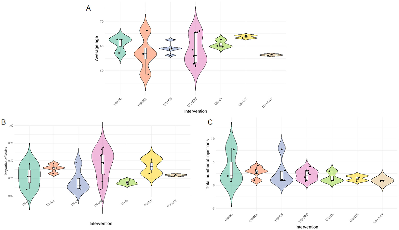 To evaluate potential systematic bias in indirect comparisons, a transitivity assessment was performed on three key effect modifiers affecting outcomes: age, gender, and number of injections, as shown in Figure 5. A composite figure integrating violin plots, box plots, and scatter plots was employed to visualize their distributional characteristics. Results demonstrated that male proportions across interventions ranged from 25% to 75%, mean ages generally distributed between 50 to 65 years, and total injection frequencies were predominantly concentrated within 1 to 5 administrations. The overall distributions exhibited no abnormal trends and did not constitute systematic bias. The transitivity assumption was validated.
