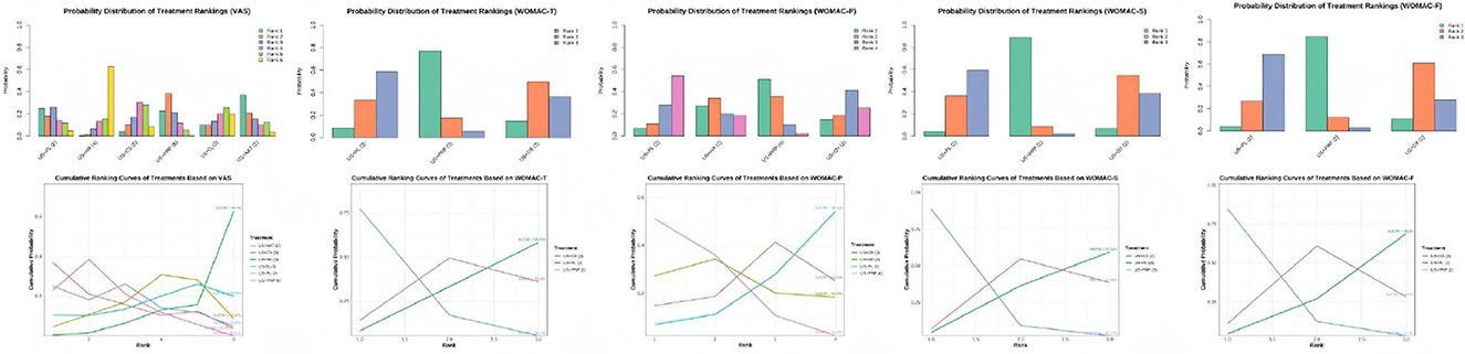 We generated the cumulative SUCRA ranking curves and probability distribution diagrams of rank positions for interventions based on five outcome measures, as shown below. Performance variations existed among interventions across different outcome measures. US+PRP demonstrated higher cumulative ranking probabilities in most indicators, suggesting it may yield optimal effectiveness in pain relief and functional improvement. Regarding VAS, US+AAT exhibited the best intervention effect, followed by US+PRP and US+PL, indicating all three approaches effectively alleviated pain. Regarding WOMAC outcomes, US+PRP demonstrated the optimal interventional efficacy across all WOMAC parameters, indicating its superiority over other approaches in alleviating patient pain, improving knee function, and reducing stiffness severity (Figure 7).