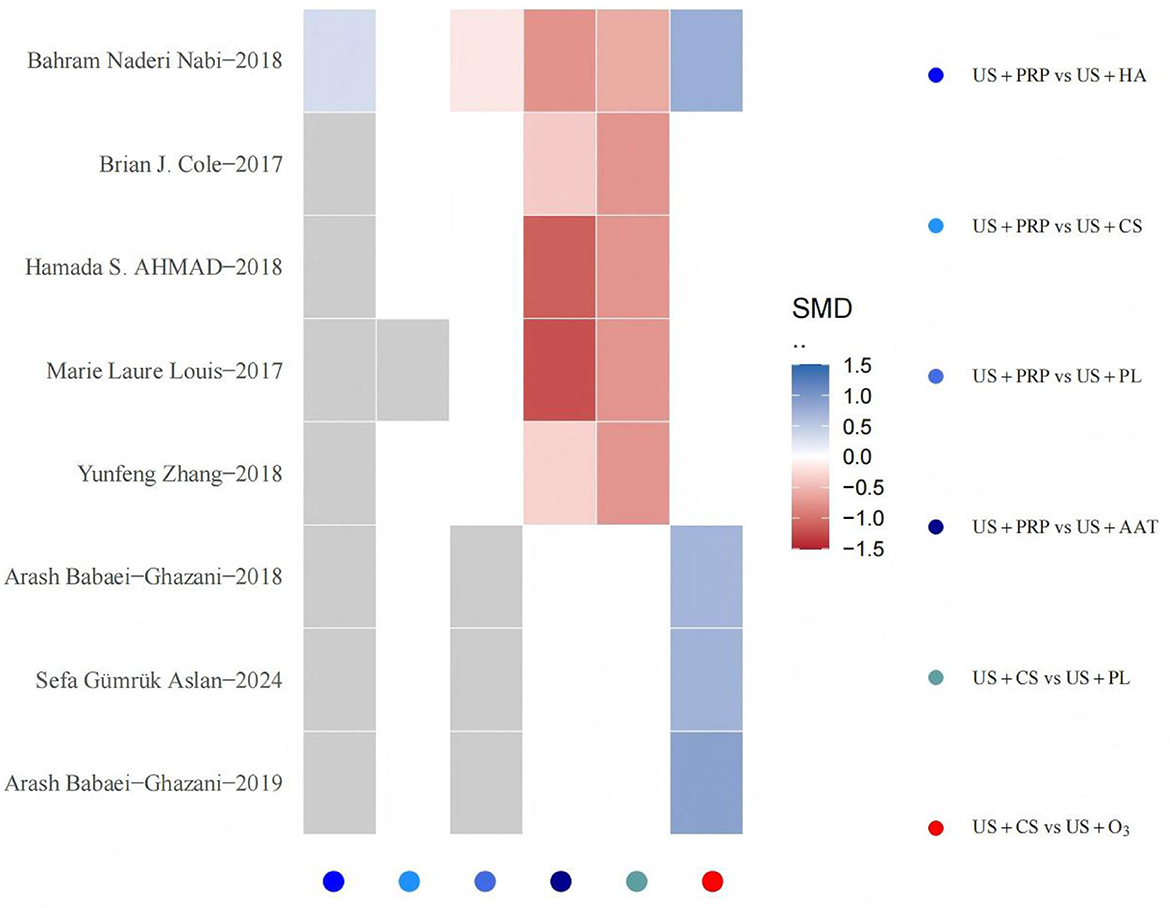 To evaluate the robustness of findings, sensitivity analyses were performed for interventional approaches with at least three included studies. The stepwise elimination method was employed to quantitatively assess individual studies' impact on overall effects, observing directional changes and magnitude variations in SMDs and 95% CIs between intervention pairs. Results indicated that exclusion of any single study did not cause substantial changes in effect estimates or statistical significance, suggesting strong structural stability of the model. Specifically, the effect estimates for US+PRP interventional approaches remained relatively stable after sequential exclusion of multiple studies, further demonstrating the model's robustness against interference under this outcome measure. Following exclusion of studies such as “Ahmad et al. (24)” and “Louis et al. (29)”, although the SMD variation for US+HA interventional pairs exceeded ±1, the significance level showed no substantial alteration and did not constitute conclusive interference. The sensitivity analysis results demonstrate that the BNMA model exhibits high stability (Figure 8).