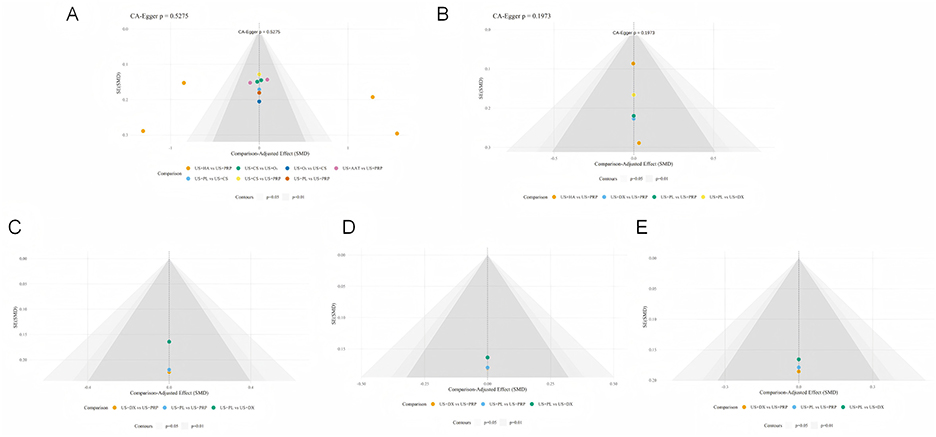 Figure 9. Corrected funnel plots across different outcome measures (A: VAS, B: WOMAC-T, C: WOMAC-P, D: WOMAC-S, E: WOMAC-F).