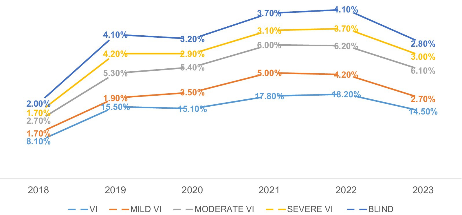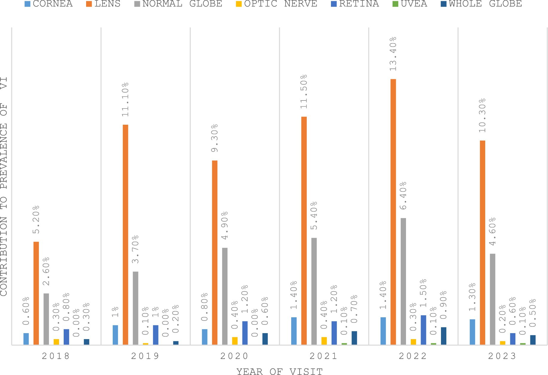The two leading causes of VI were diseases that affected the lens, followed by those that affected the normal globe (Figure 2). Over the study period, diseases of the lens consistently contributed most to the prevalence of VI, with the highest contribution recorded in 2022 (13.4%). This was followed by diseases affecting the normal globe, including refractive errors. The prevalence of normal globe diseases increased steadily from 2018 (2.6%) to 2022 (6.4%), then marginally decreased in 2023 (4.6%).