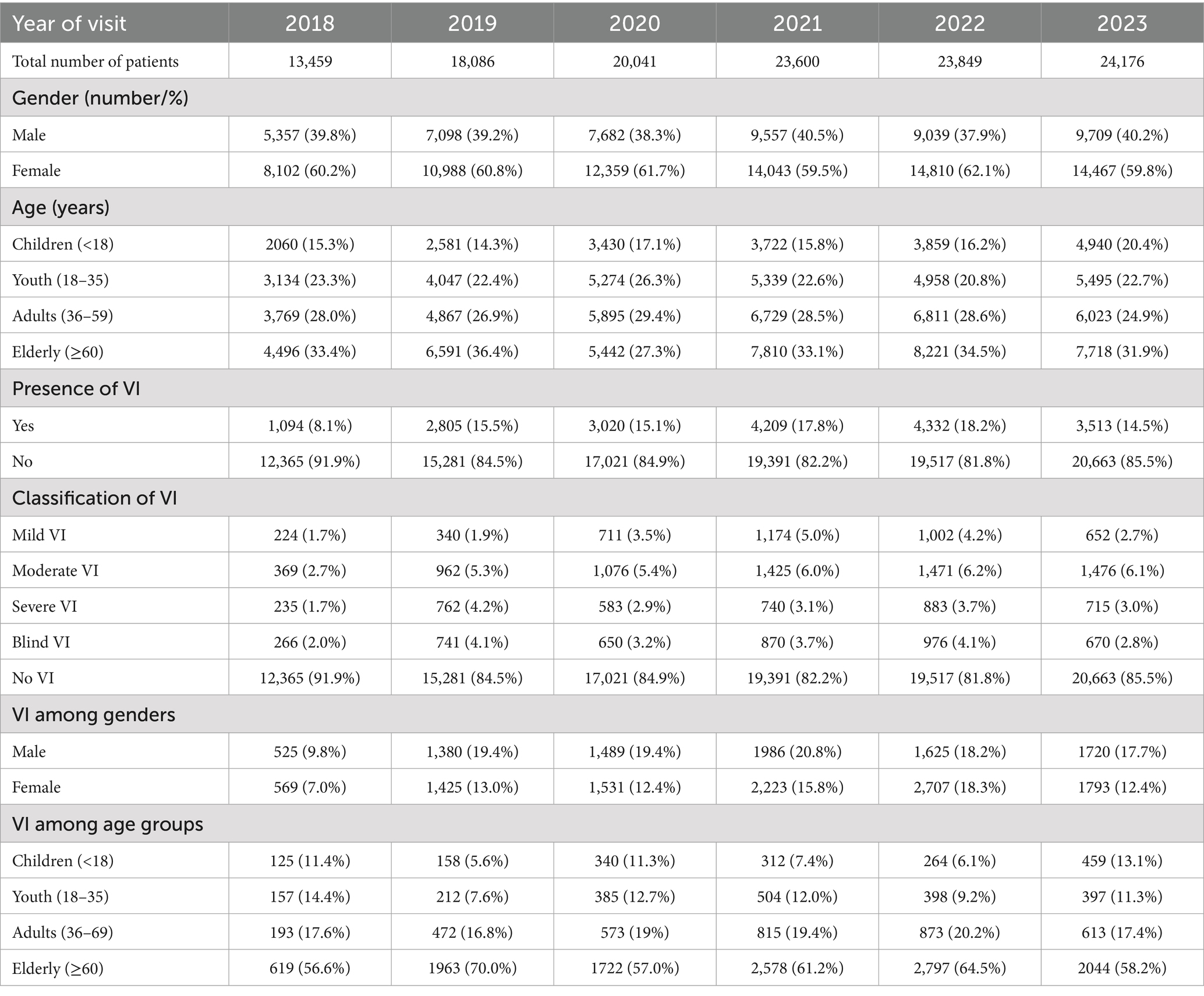 The prevalence and distribution of VI is detailed in Table 1. From 2018 to 2023, patient numbers at the selected hospitals increased steadily from 13,459 to 24,176, with females consistently representing about 60% of the hospital attendance. The elderly (≥60 years) and adults (36–59 years) formed the largest groups, while children showed a notable rise in 2023. Vision impairment prevalence grew from 8.1% in 2018 to a peak of 18.2% in 2022 before declining marginally to 14.5% in 2023; with moderate VI being the most common VI. Females generally had higher VI prevalence than males, though male cases increased markedly in 2022. Across all years, the elderly had the greatest burden of VI, accounting for over 60% of cases, followed by adults, while children and youth contributed smaller proportions.