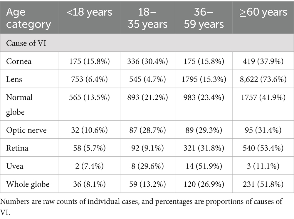 Overall, the causes of VI increased with age for all causes except diseases of the lens and retina, which were predominantly prevalent among the elderly. Diseases of the lens and retina were the leading causes of VI among patients aged 60 years or older, accounting for 73.6 and 53.4% of cases, respectively. For all other causes, the trend increased gradually until it peaked in the elderly group (Table 2).