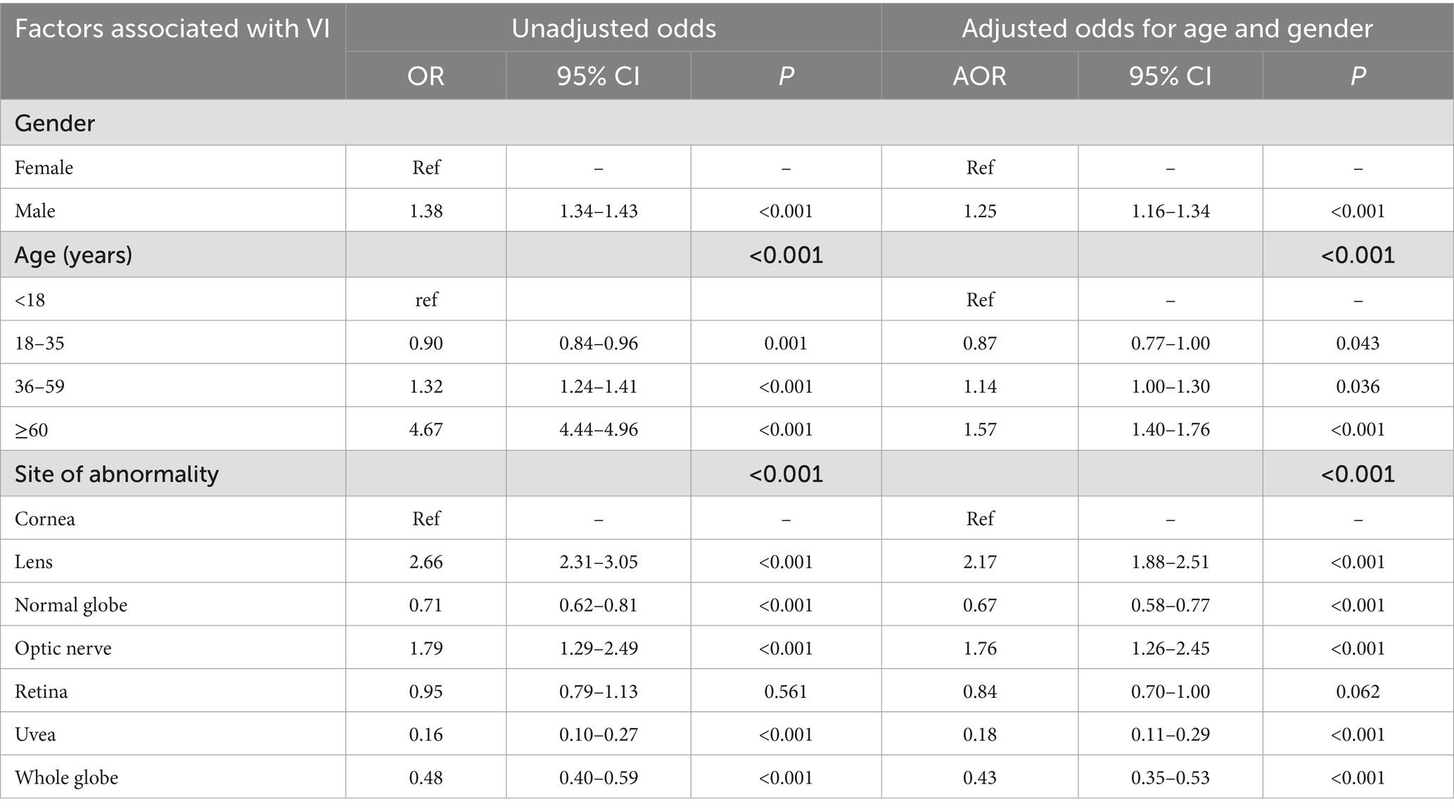 A binary logistic regression analysis (Table 3) showed that being male (OR: 1.38; 95% CI: 1.34–1.43), aged 36–59 years (OR: 1.32; 95% CI: 1.24–1.41), and/or aged ≥60 years (OR: 4.67; 95% CI: 4.44–4.96) had a significantly increased risk of VI. Regarding the causes of VI, diseases of the lens (OR: 2.66; 95% CI: 2.31–3.05) and optic nerve diseases (OR: 1.79; 95% CI: 1.29–2.49) were significantly associated with increased risk of VI. After adjusting for age and gender, males had higher odds of VI (AOR: 1.25; 95% CI: 1.16–1.34), adults (AOR: 1.14; 95% CI: 1.00–1.30), and the elderly had nearly two times the odds of VI (AOR: 1.57; 95% CI: 1.40–1.76). Regarding the causes of VI, diseases of the lens (AOR: 2.17; 95% CI: 1.88–2.51) and optic nerve diseases (AOR: 1.76; 95% CI: 1.26–2.45) were significantly associated with increased risk of VI.