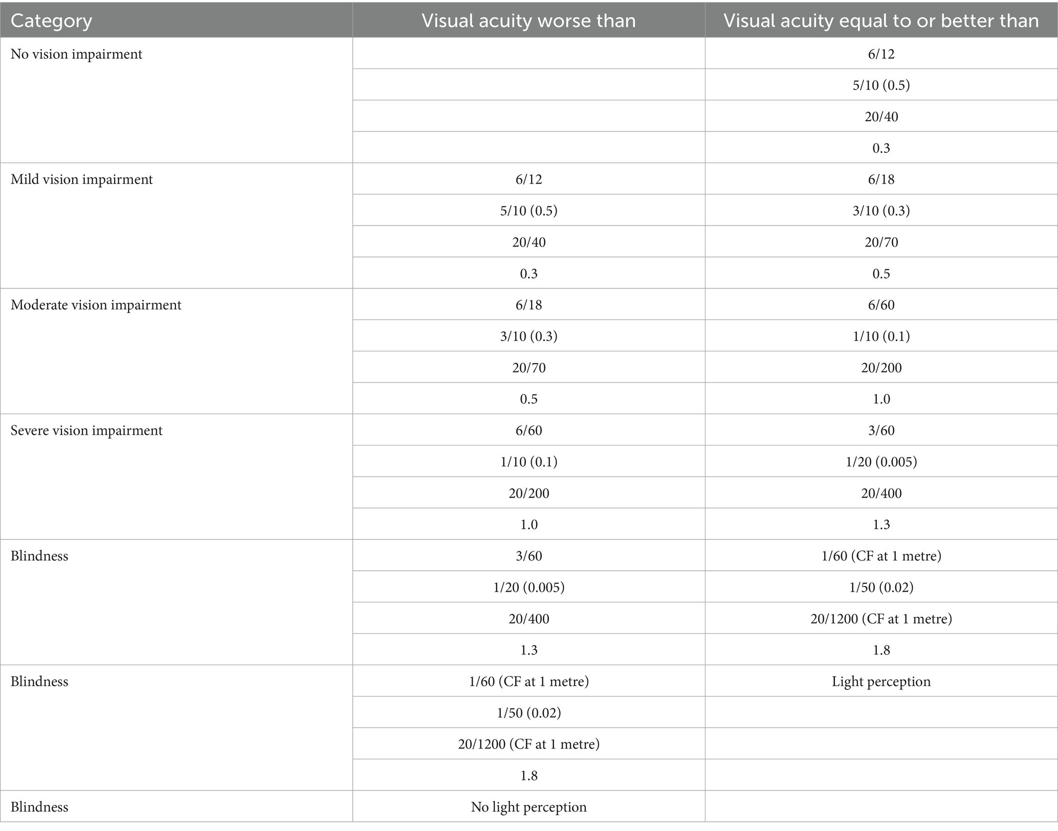 Vision Impairment (VI) was classified using the International Classification of Diseases 11 (28). No VI was defined as presenting visual acuity (PVA) equal to or better than 6/12 in the better seeing eye. Presenting VA worse than 6/12 but better than 6/18 was classified as mild VI, PVA worse than 6/18 but better than or equal to 6/60 in the better-seeing eye was classified as moderate VI, and PVA worse than 6/60 but better than 3/60 was classified as severe VI. Blindness was defined as PVA worse than 3/60 in the better-seeing eye, with optical correction, if any (Appendix 1) (28). Refractive error was classified as myopia if the spherical power was ≤ − 0.50 Dioptre Sphere (DS) and hyperopia if it was ≥ + 0.50 DS. Astigmatism was considered significant when it was >0.50 Dioptre cylinder (15, 29). For ease of analysis, participants were grouped into four age ranges: children (<18 years), youth (18–35 years), adults (36–59 years), and the elderly (>60 years).