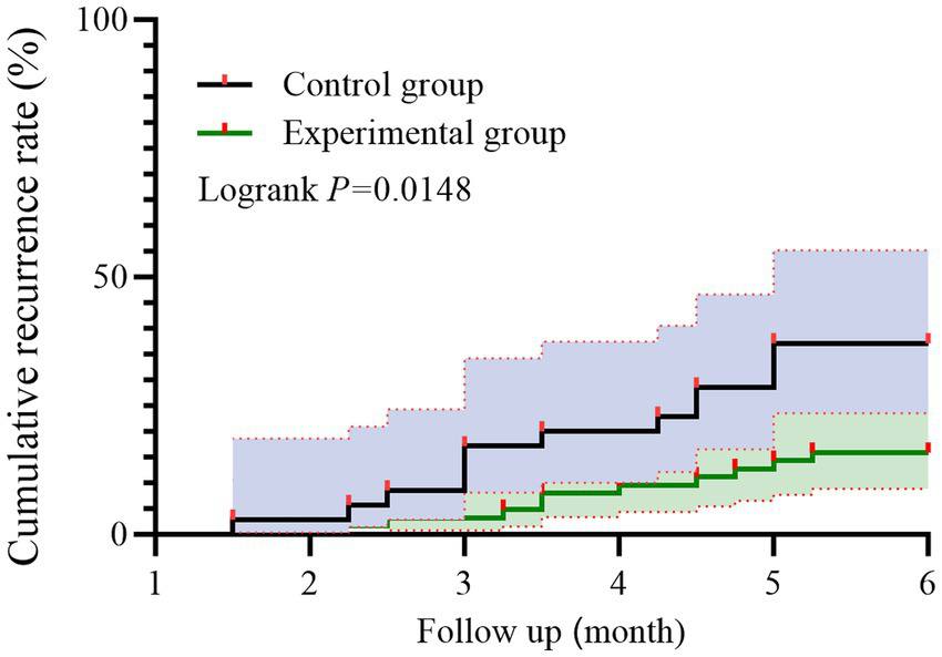 The normality of continuous variables was tested using the Shapiro–Wilk test. Normally distributed data were analyzed using the independent-samples t-test, whereas non-normally distributed data were analyzed using the Mann–Whitney U-test. Continuous variables were summarized as mean ± SD or median (P25, P75). Between-group differences were tested using independent t-tests (Welch’s if variances were unequal) or Mann–Whitney U-tests; within-group (pre–post) differences were tested using paired t-tests or Wilcoxon signed-rank. Categorical data were shown as percentages and analyzed using chi-squared, continuity-corrected chi-squared, or Fisher’s exact test. Ordinal data were assessed using the rank-sum test. Kaplan–Meier curves with log-rank tests were used for recurrence analysis. Cox regression analysis was performed to identify associated risk factors, with p < 0.05 considered statistically significant. The proportional hazards assumption was tested using Schoenfeld residuals. All statistical analyses were conducted using SPSS version 26.0 (IBM Corp., USA). A two-tailed test was applied for all analyses, with a significance level of α = 0.05.