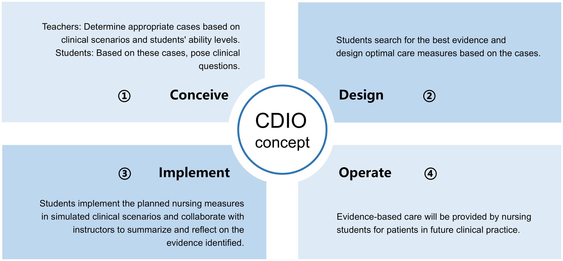 The evidence-based nursing curriculum for this study was designed using a model that integrated CBL and the CDIO framework. The evidence-based nursing course comprises 10 sessions, of which 5 employ this instructional model, each lasting 4 h. It is taught by XYZ and HY, two veteran teachers who have instructed the evidence-based nursing curriculum for 10 to 15 years. Cases were obtained from real clinical scenarios and were selected at the discretion of these two senior faculty members, as well as clinical professionals. This teaching approach comprises the following components: basic knowledge instruction, case selection, group discussion, PPT production, timely feedback, and course reflection. The CDIO framework was implemented in a step-by-step process as the course unfolds. Figure 2 illustrates the specific steps of the CDIO framework application.