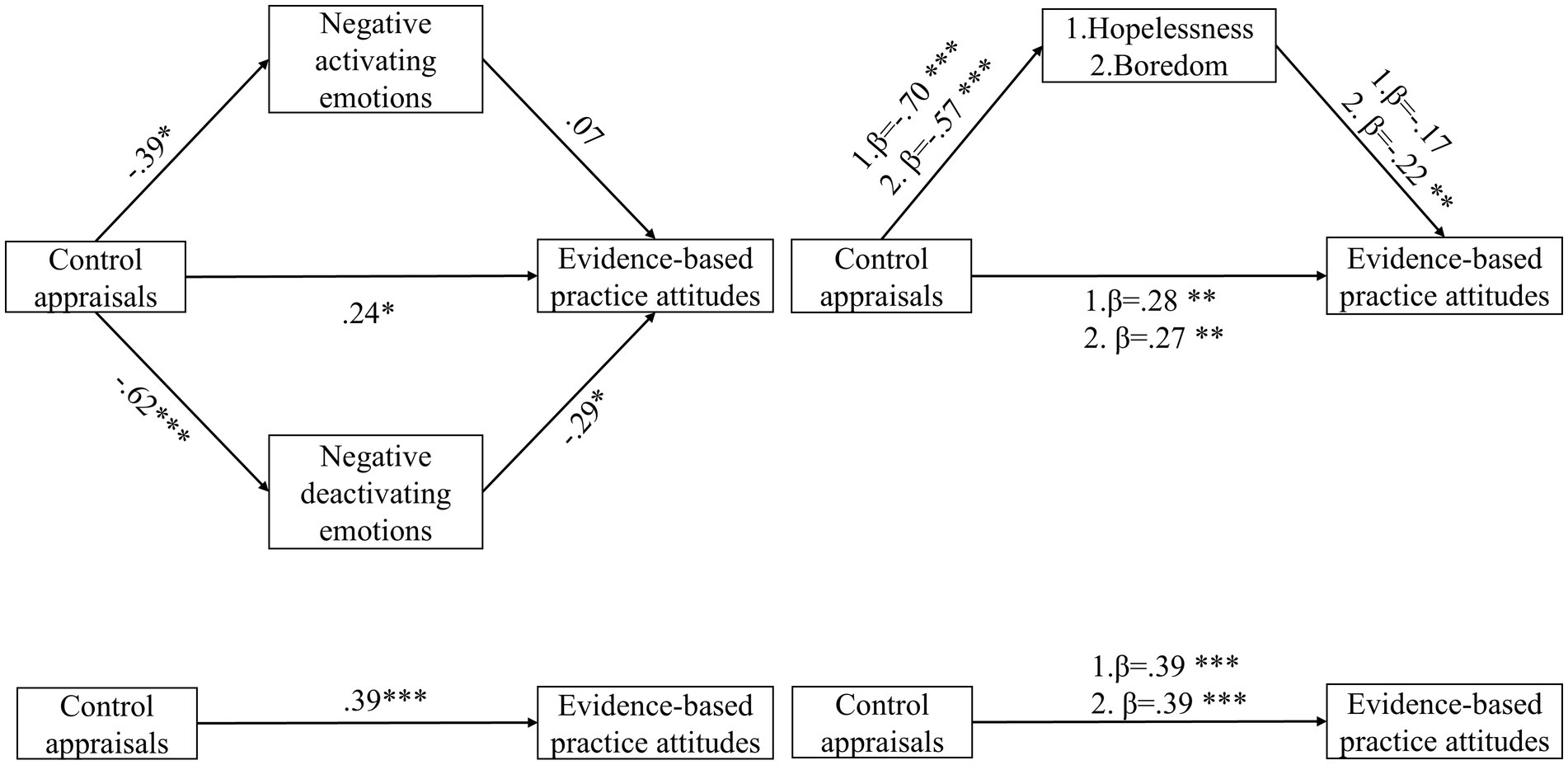Figure 3. Mediating effects of achievement emotions between control appraisals and evidence-based practice attitudes. *p < 0.05, **p < 0.01, ***p < 0.001.