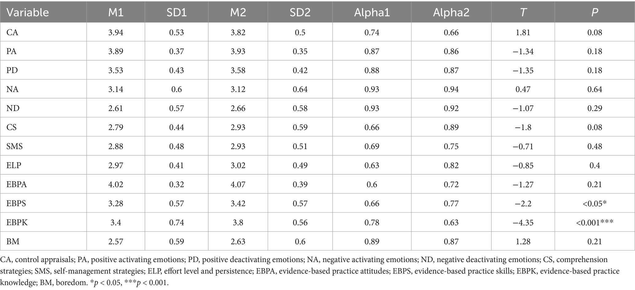 Table 1 presents the descriptive statistical information, t-values, and Cronbach’s alphas for all variables. The results demonstrated high levels of control appraisals both before and after the instructional model, despite a decline at the second measurement (M1 = 3.94, SD1 = 0.53; M2 = 3.82, SD2 = 0.50).
