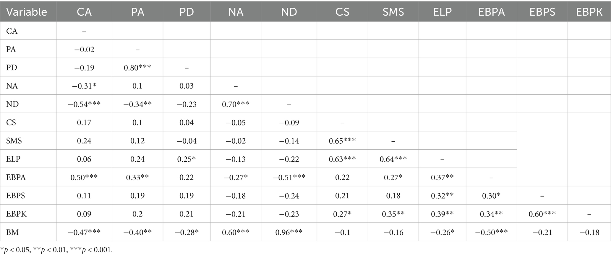 Table 2 gives the correlations between the post-instructional model study variables. Control appraisals were significantly negatively correlated with negative activating (r = −0.31, p < 0.05), and deactivating emotions (r = −0.54, p < 0.001), while not significantly correlated with the other two emotional dimensions and learning strategies. Moreover, control appraisals were positively associated with attitudes (r = 0.50, p < 0.001) and were not significantly correlated with skills and knowledge. The correlations of control appraisals with achievement emotions, learning strategies, and evidence-based practice competencies did not fully hold, so Hypothesis 2 was partially supported. In the emotions and learning strategies dimension, only the correlation between positive deactivating emotions and effort level and persistence was significant (r = 0.25, p < 0.05). Positive activating emotions were positively correlated with attitudes (r = 0.33, p < 0.01), while positive deactivating emotions were not significantly related to attitudes. Negative activating (r = −0.27, p < 0.05) and deactivating emotions (r = −0.51, p < 0.001) were negatively correlated with attitudes. In addition, none of the dimensions of emotion were significantly correlated with skills and knowledge, so Hypothesis 3 partially supported. Regarding the relationship between learning strategies and evidence-based practice competencies, comprehension strategies (r = 0.27, p < 0.05) were positively correlated with knowledge. Besides, self-management strategies were positively related to attitudes (r = 0.27, p < 0.05) and knowledge (r = 0.35, p < 0.01), while no significant correlation was found with skills. Lastly, effort level and persistence were positively associated with attitudes (r = 0.37, p < 0.01), skills (r = 0.32, p < 0.01), and knowledge (r = 0.39, p < 0.01).