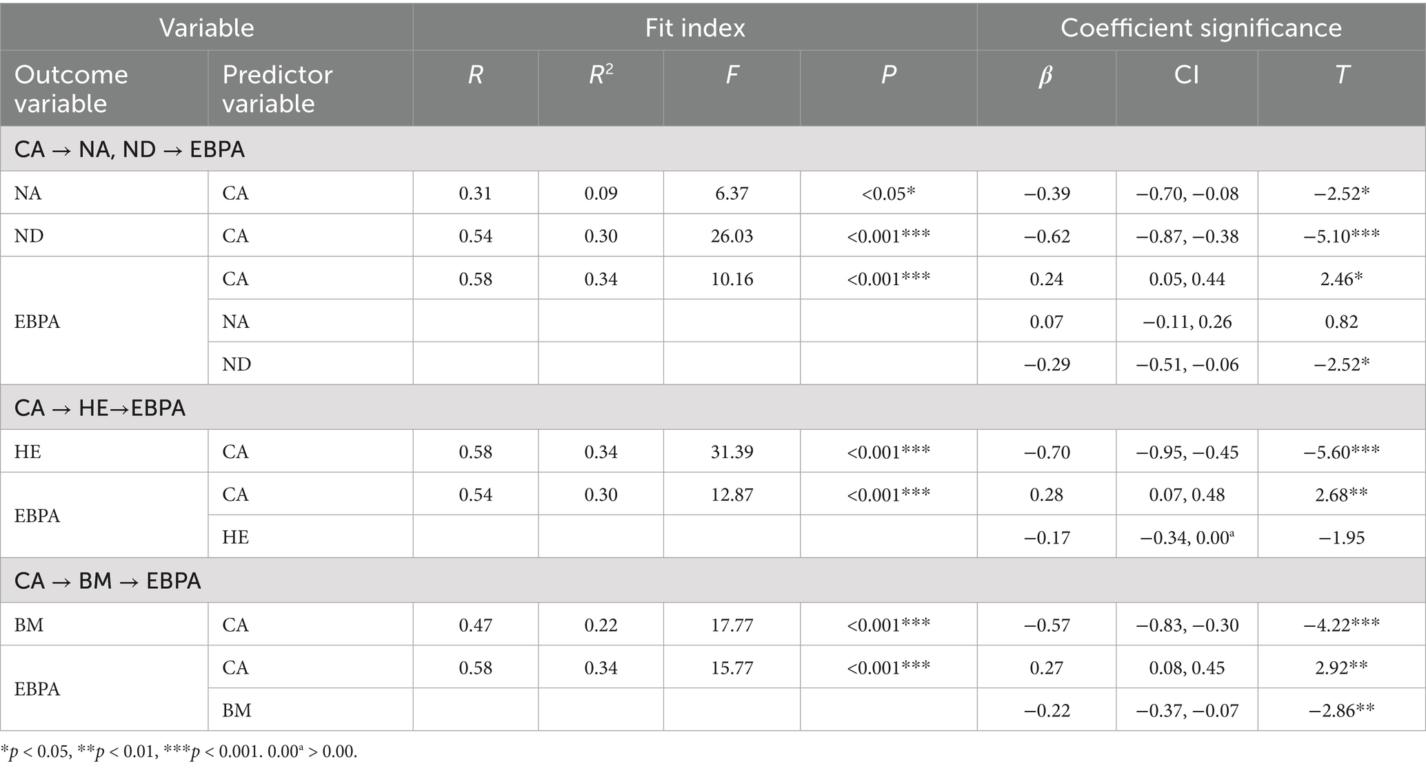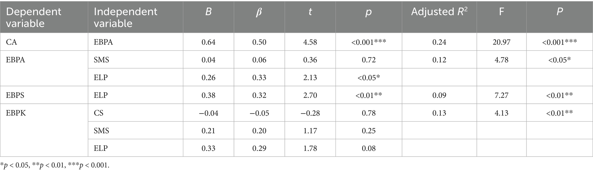 As can be seen in Table 5, the test was conducted by setting attitudes as the independent variable and control appraisals as the dependent variable. The results indicated that attitudes had a significant positive influence on control appraisals (β = 0.50, p < 0.001) and that the independent variable explained 24% of the variance in the dependent variable. In contrast, learning strategies, knowledge and skills were not associated with control appraisals showed that Hypothesis 5 partially supported. The impact of learning strategies on evidence-based practice competencies was explored next. As for attitudes, only effort level and persistence (β = 0.33, p < 0.05) had an impact. In addition, effort level and persistence positively affected skills (β = 0.32, p < 0.01) but only explained 9% of the variance in the dependent variable. The rest could be explained by other variables outside the model. Lastly, none of the learning strategies had a significant effect on knowledge; thus, Hypothesis 6 was partially valid.