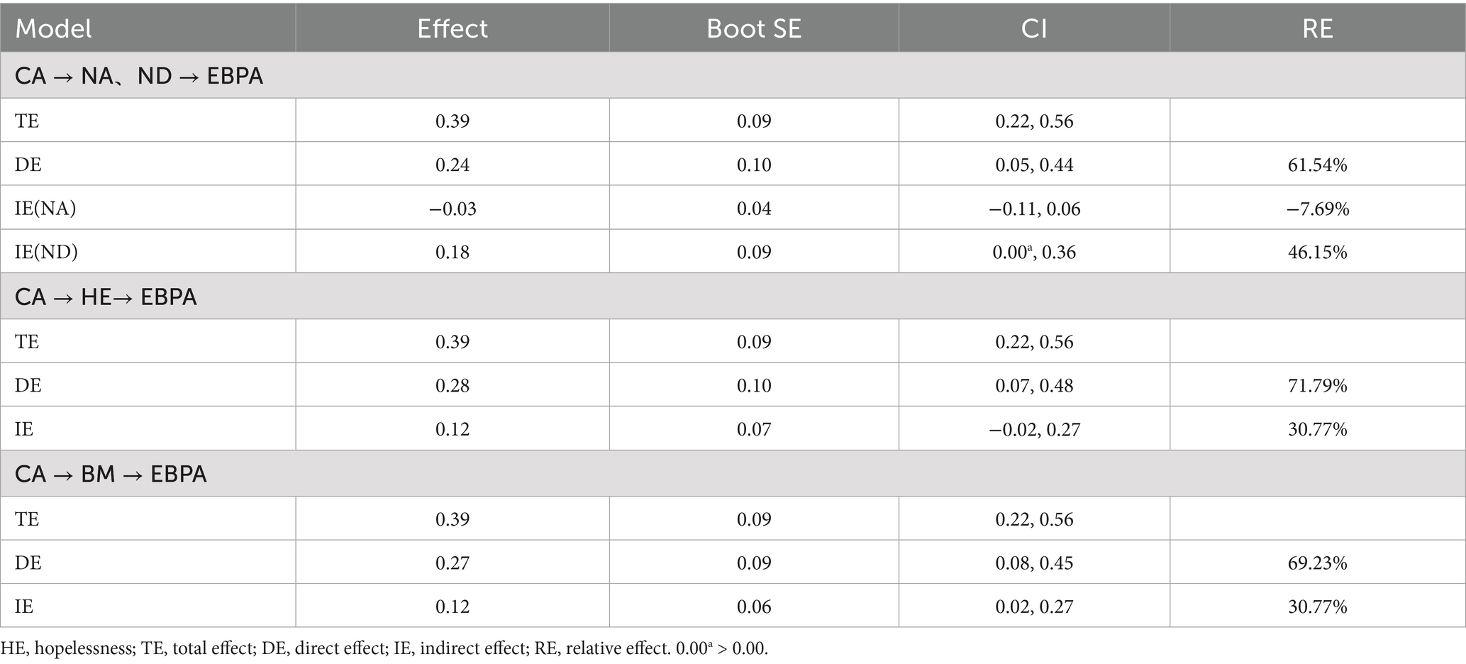 Since there was no correlation between control appraisals and learning strategies, we focused on the mediating effects among the other variables. Table 3 and Figure 3 demonstrate the fit indexes and coefficient significance for the mediating effects of achievement emotions between control appraisals and attitudes. Effect values for the mediation models of achievement emotions are shown in Table 4. We found that the path with negative activating emotions as a mediating variable did not hold (95%CI: −0.11, 0.06), whereas the path with negative deactivating emotions as the mediating variable did hold (95%CI: 0.00a, 0.36). Afterwards, we performed further tests and found that hopelessness as a mediating variable failed to hold (95%CI: −0.02, 0.27), while boredom did.