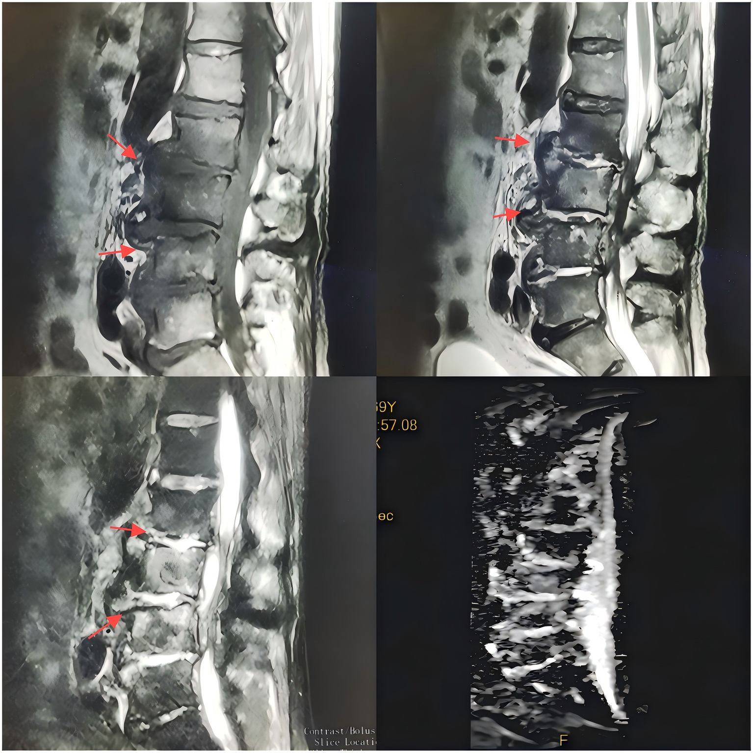 Upon admission, the patient’s body temperature was 40.3 °C, accompanied by chills, fatigue, shortness of breath, and tachycardia, but his blood pressure was normal (126/88 mmHg). Laboratory tests showed a white blood cell count of 8.8 × 109/L (normal range: 3.5–9.5 × 109/L), neutrophil count of 83.10 × 109/L (normal range: 1.8–6.3 × 109/L), lymphocyte count of 11.40 × 109/L (normal range: 1.1–3.2 × 109/L), procalcitonin level of 1.175 ng/mL (normal range: <0.05 ng/mL), interleukin-6 level of 84.46 pg/mL (normal range: <7 pg/mL), erythrocyte sedimentation rate (ESR) of 58 mm/h (normal range: 0–15 mm/h), negative tuberculosis PCR, a negative interferon-gamma release assay (IGRA), negative tuberculosis PCR, negative Brucella agglutination test, negative TORCH test results, and multiple negative blood and sputum cultures. Persistently negative conventional cultures in CREC infections are not uncommon, as these pathogens often require specialized media or prolonged incubation for detection (10). CT scans revealed irregular bone structures in the L2–L5 intervertebral discs, with fluid-filled dark areas around the discs and bilateral psoas muscles, suggesting tuberculous abscess changes. Lumbar MRI showed tuberculosis in the L2–L5 vertebrae, with surrounding soft tissue abscess formation, spinal stenosis at the corresponding segments, and compression of the conus medullaris and cauda equina (Figures 1, 2).