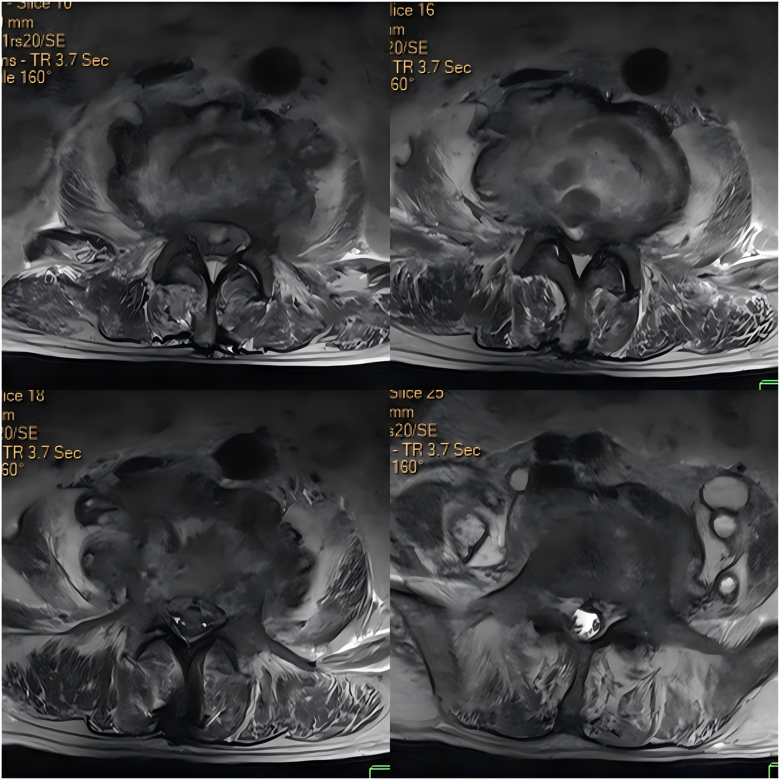 T1-weighted MR images of the intervertebral discs acquired with varying flip angles.