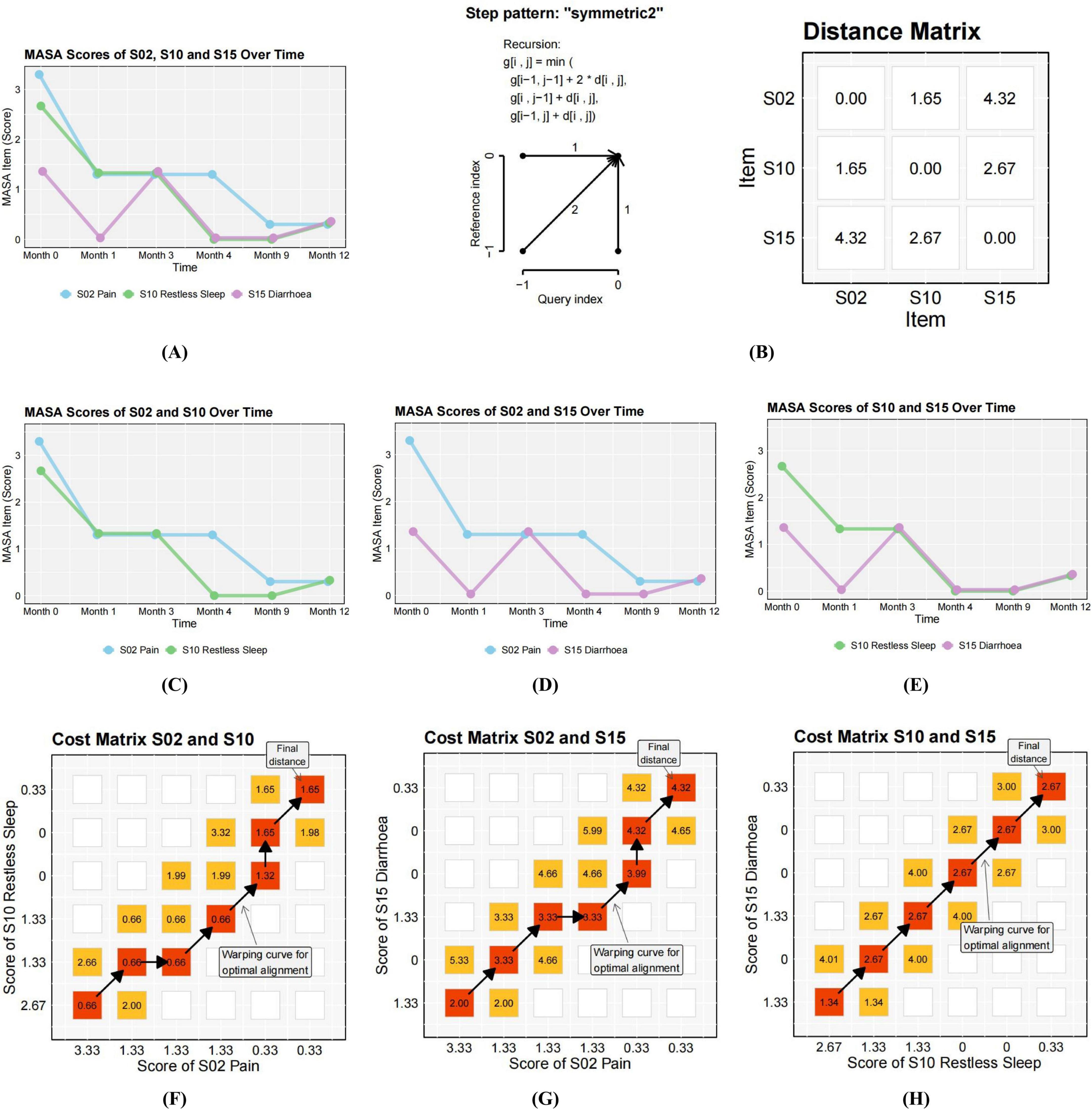 Figure 1. Explanation of the dynamic time warp (DTW) analysis. DTW quantifies similarity between temporal sequences (here, symptom trajectories of three MSAS items). The algorithm first constructs a 6 × 6 local cost matrix (LCM). It then identifies the optimal warping path by traversing the LCM from [1,1] to [6,6] whilst minimizing cumulative alignment cost. (A) Depicts MASA scores of S02, S10, and S15 over time. A Sakoe–Chiba bandwidth of 1 and the symmetric2 step pattern (B) were applied, following established practices in clinical symptom research (36, 37). This conservative parameter combination prevents physiologically implausible alignments while retaining sensitivity to short-term variations and ensuring unbiased alignment across time series. (C–E) demonstrate DTW distance computations for three symptom pairs, yielding distances of 1.65 (S2–S10), 4.32 (S2–S15), and 2.67 (S10–S15). The significantly lower distance for S2–S10 (1.65) indicates greatest temporal similarity. (F–H) Illustrate cost matrices and optimal warping paths for S02–S10, S02–S15, and S10–S15.