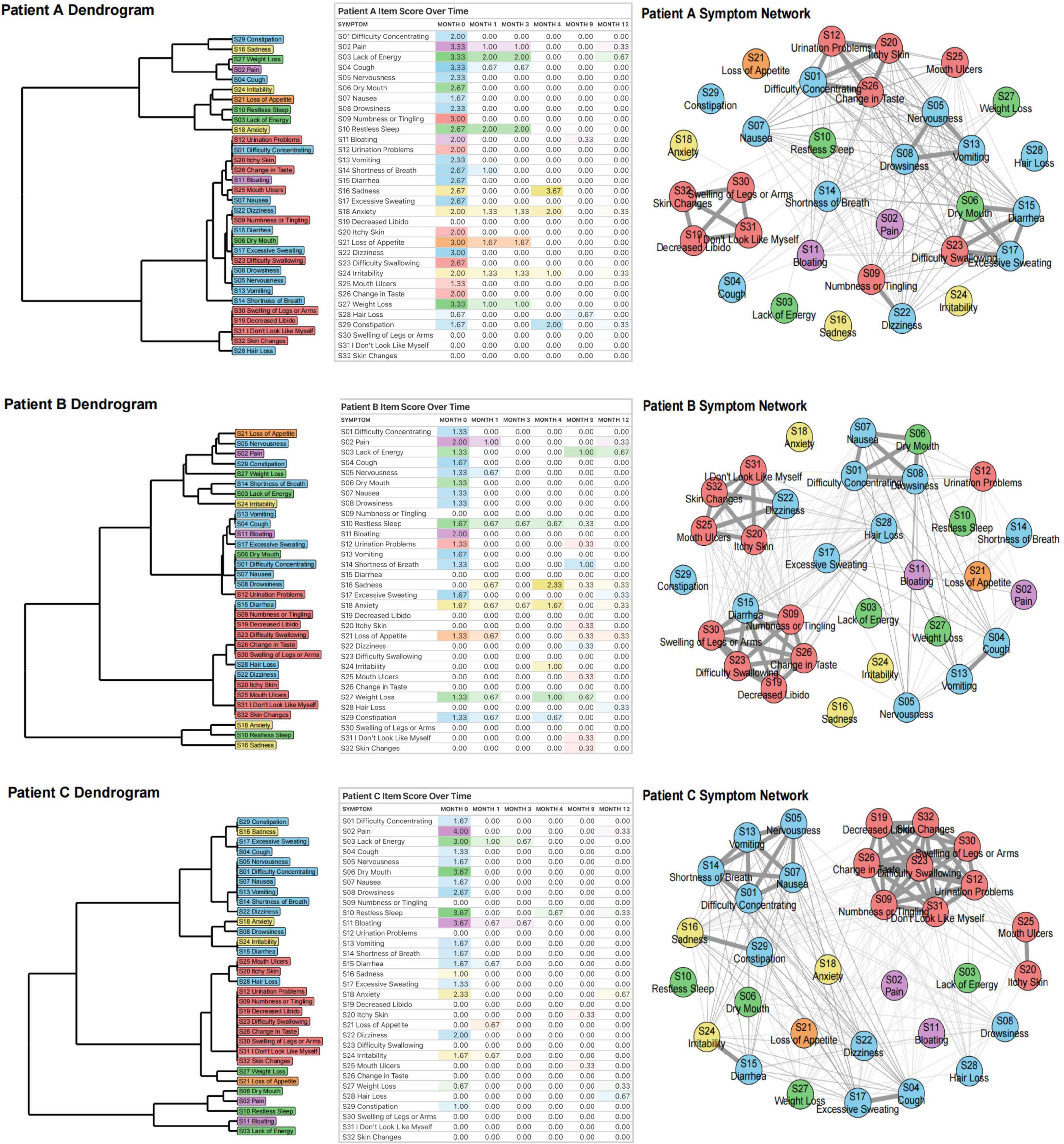 Figure 2. Dynamic Time Warping analysis of three patients (A, B, C). For each participant, we first generated a dendrogram of symptom clusters, reflecting increasingly similar symptom trajectories over time. We then compiled a rating table of raw symptom scores (severity color-coded) across six time periods. Finally, we constructed individual symptom networks using DTW analysis.