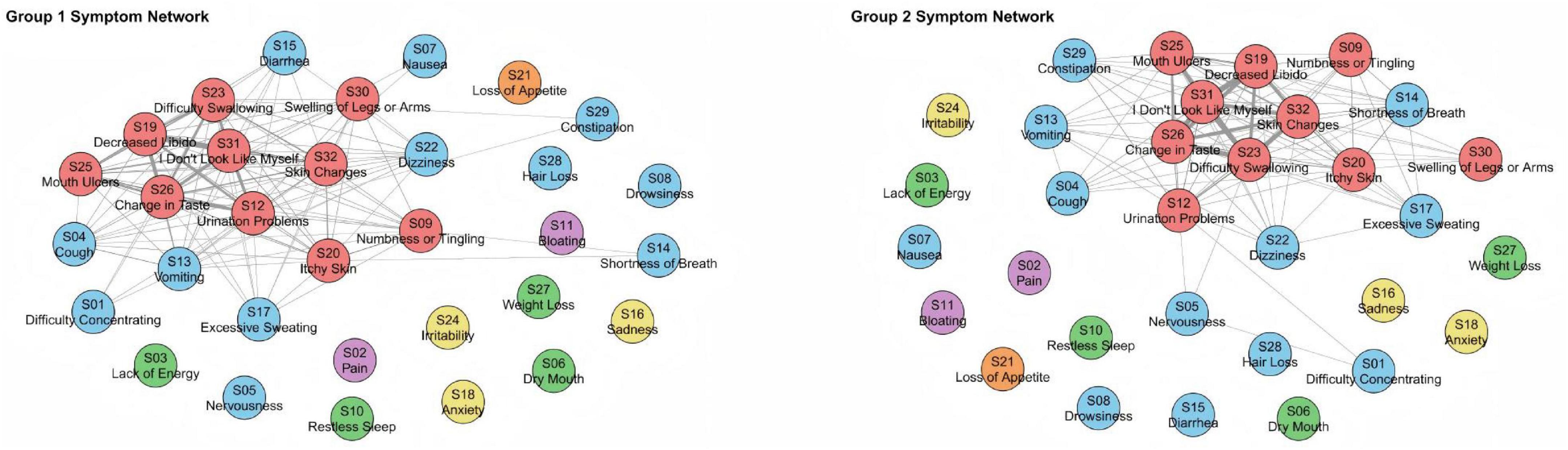 The emotional disorder cluster comprises symptoms such as S24 (irritability), S16 (sadness) and S18 (anxiety), which reflect emotional instability arising from the psychological burden of illness. These symptoms are frequently precipitated by physical discomfort, fear of disease progression, and uncertainty regarding treatment outcomes. Not only do these emotional symptoms compromise psychological well-being, but they may also adversely affect recovery trajectories. These observations are consistent with prior qualitative studies. For example, Ma et al. (12) noted that patients often experience psychological distress when confronted with unpredictable disease progression, symptom ambiguity, or fear of recurrence. Additionally, patients express a strong desire for emotional support from family, healthcare providers, and broader social networks. Similarly, Chen et al. (44) found that restrictive dietary requirements commonly impede patients’ social engagement, particularly their participation in shared meals, thereby contributing to social isolation and depressive symptoms.